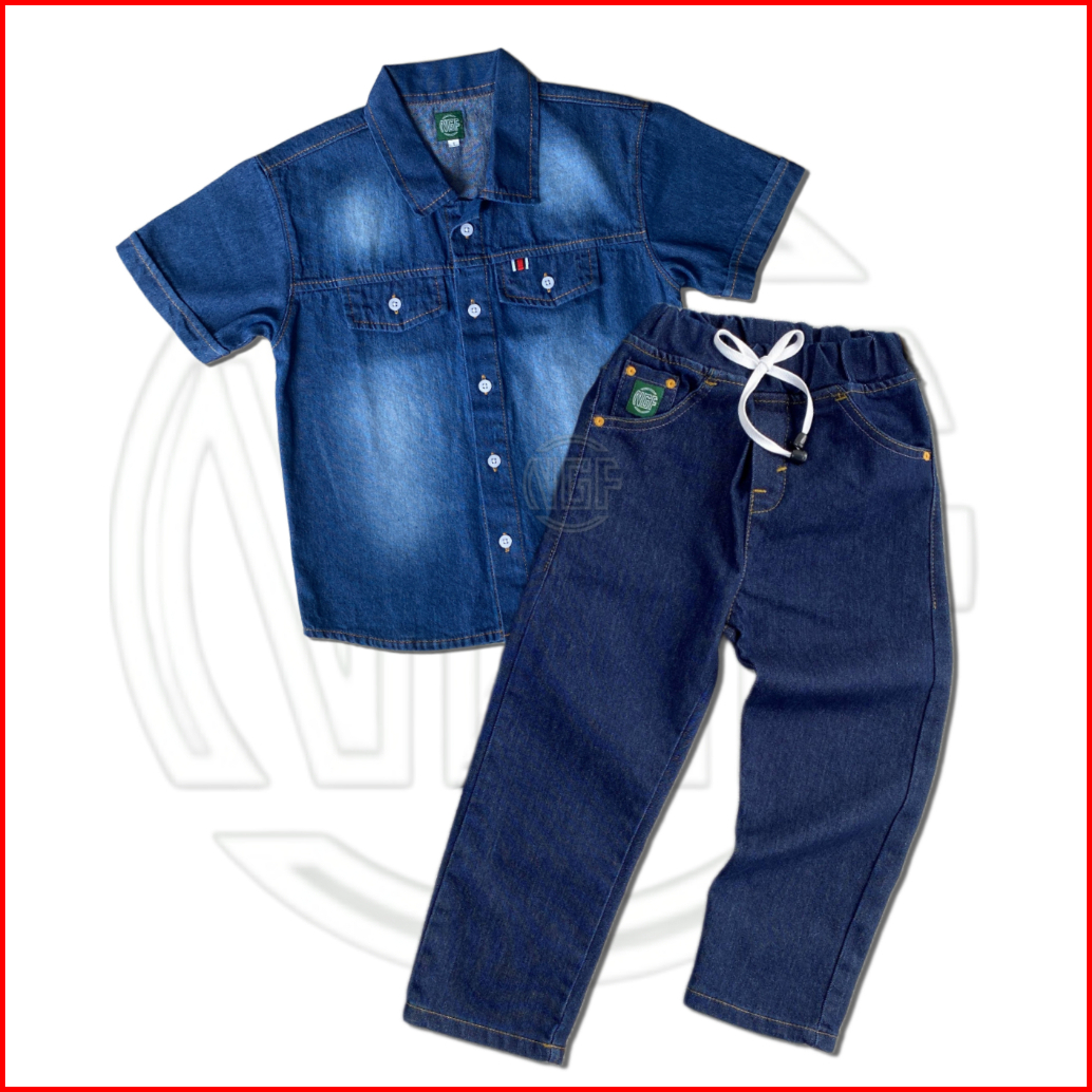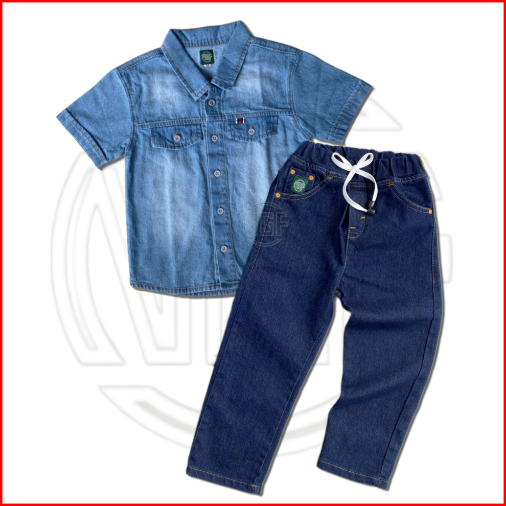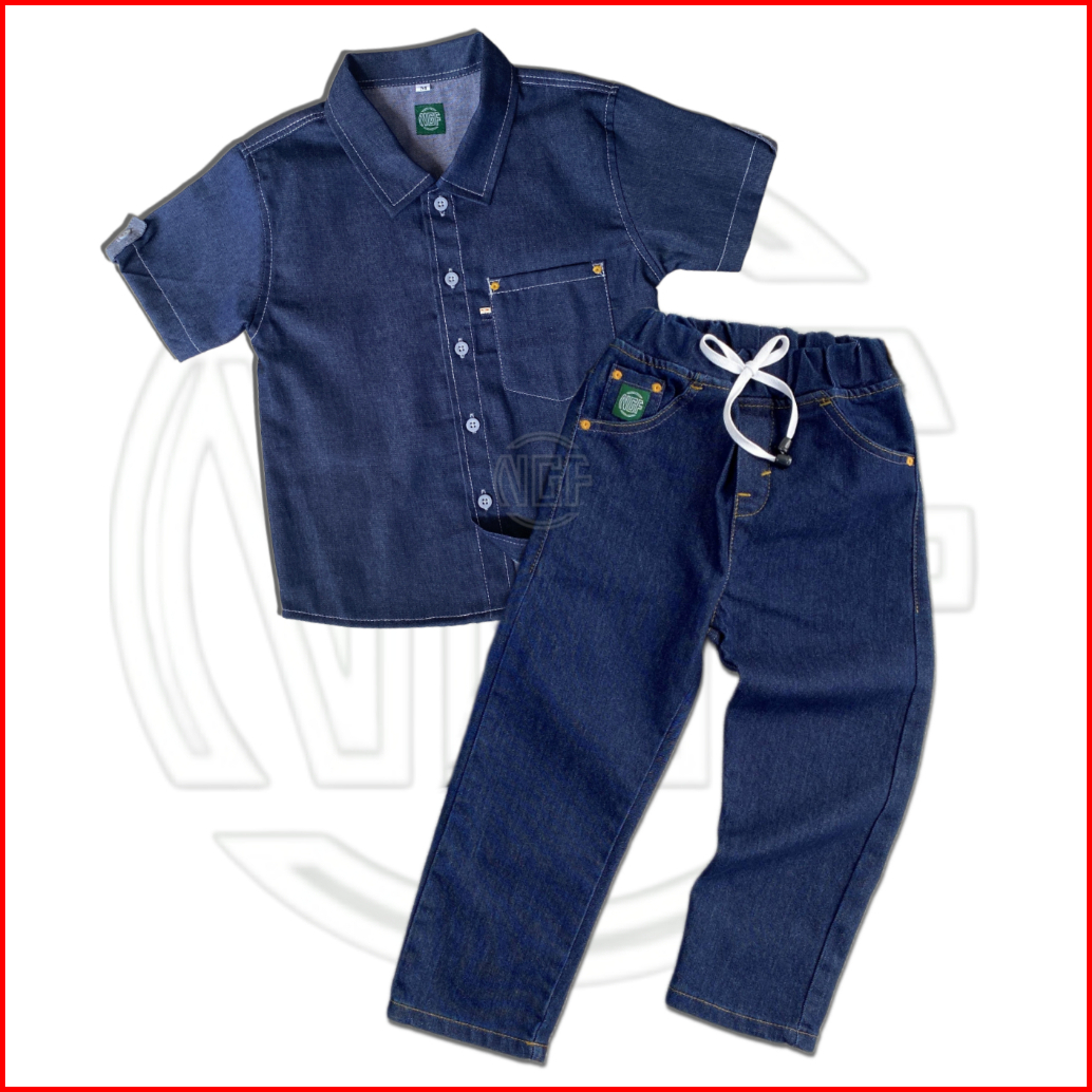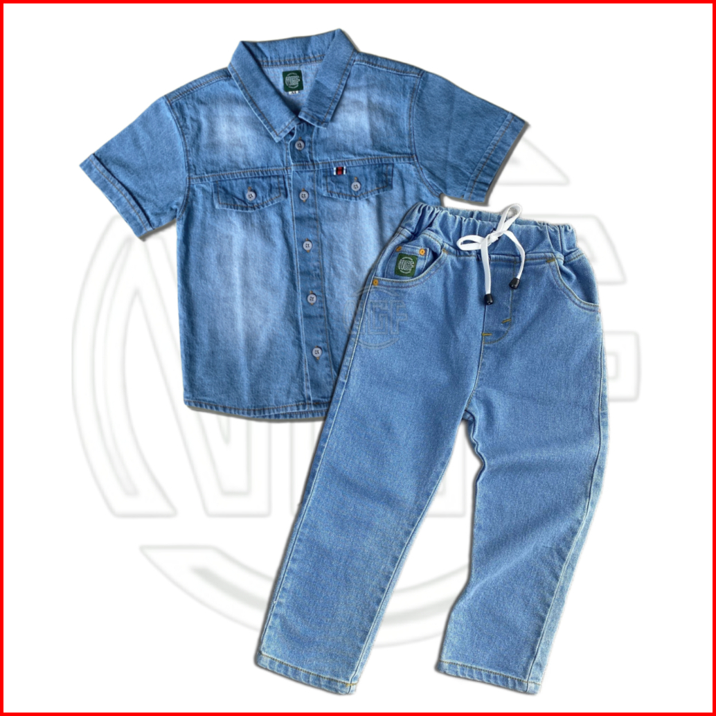 Setelan Anak Kemeja Jeans Celana Denim Stretch Adem Laki Laki 4-12 Tahun Premium M L Xl Xxl