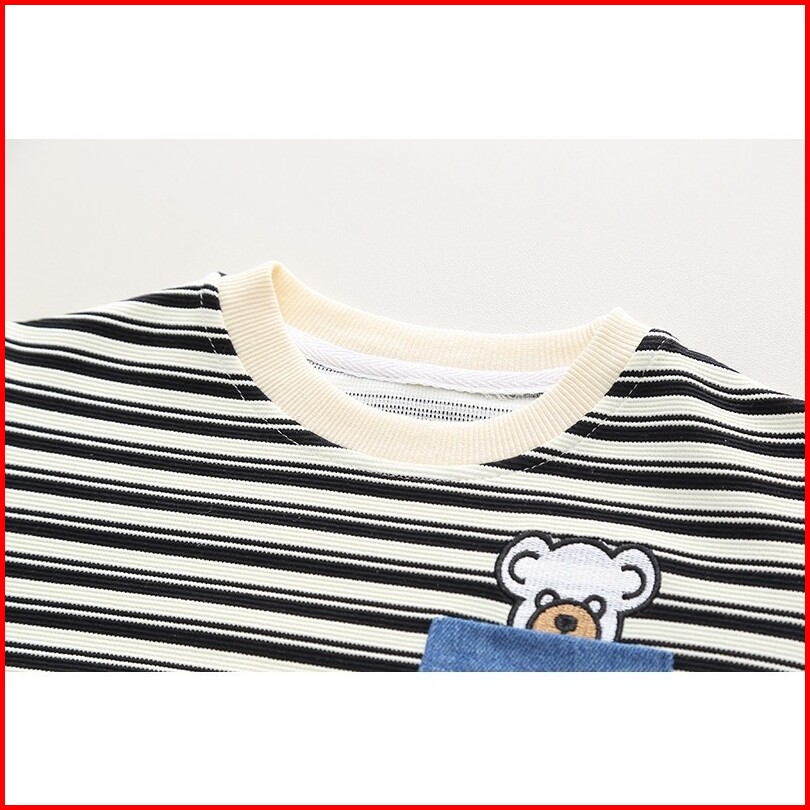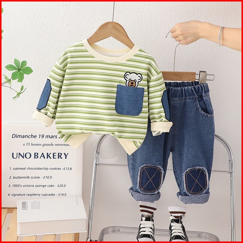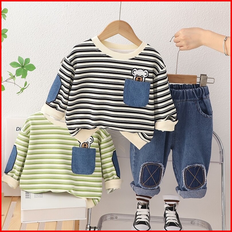 Setelan Sweater Anak Laki Laki Import Stelan Sweater Anak Balita Impor Sweater Motif Garis Garis Kantong Logo Kepala Bea