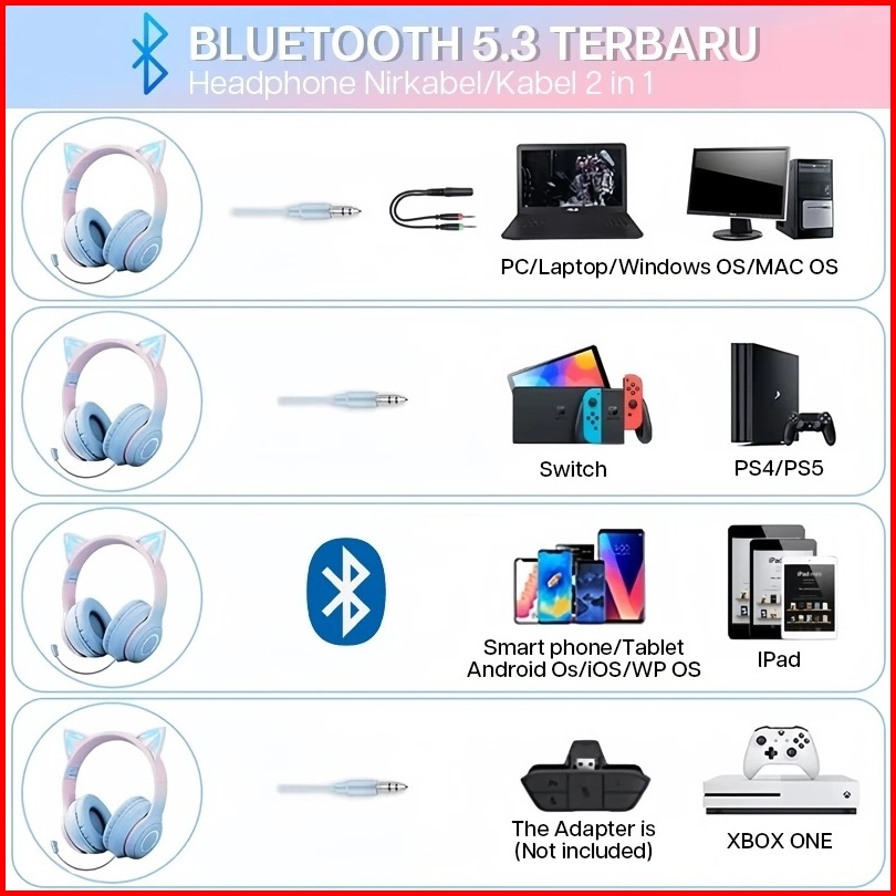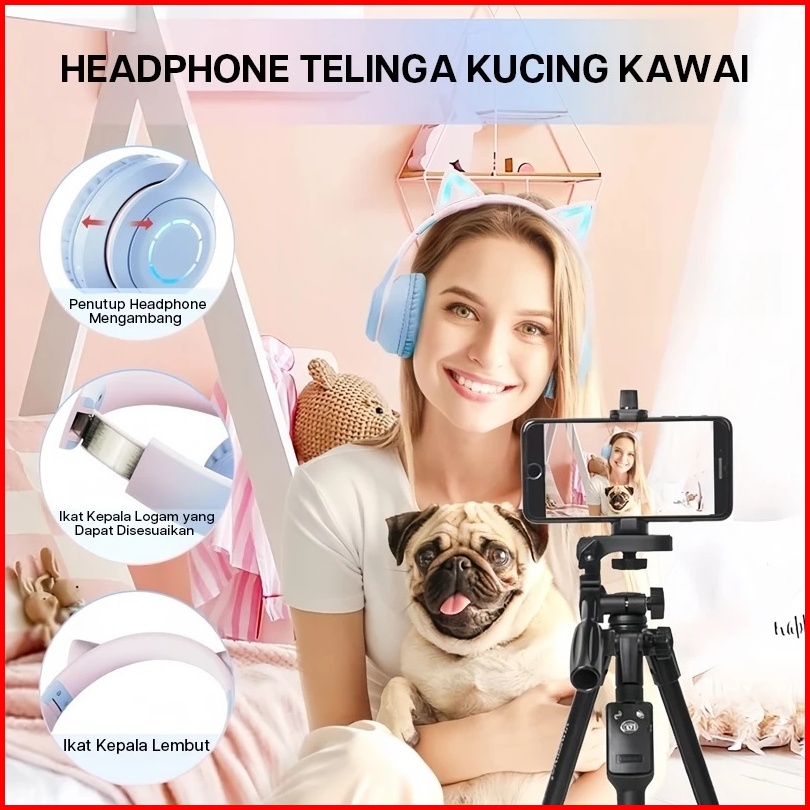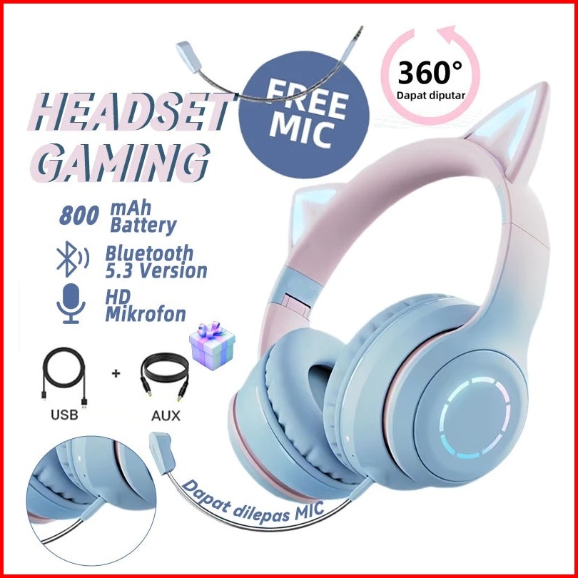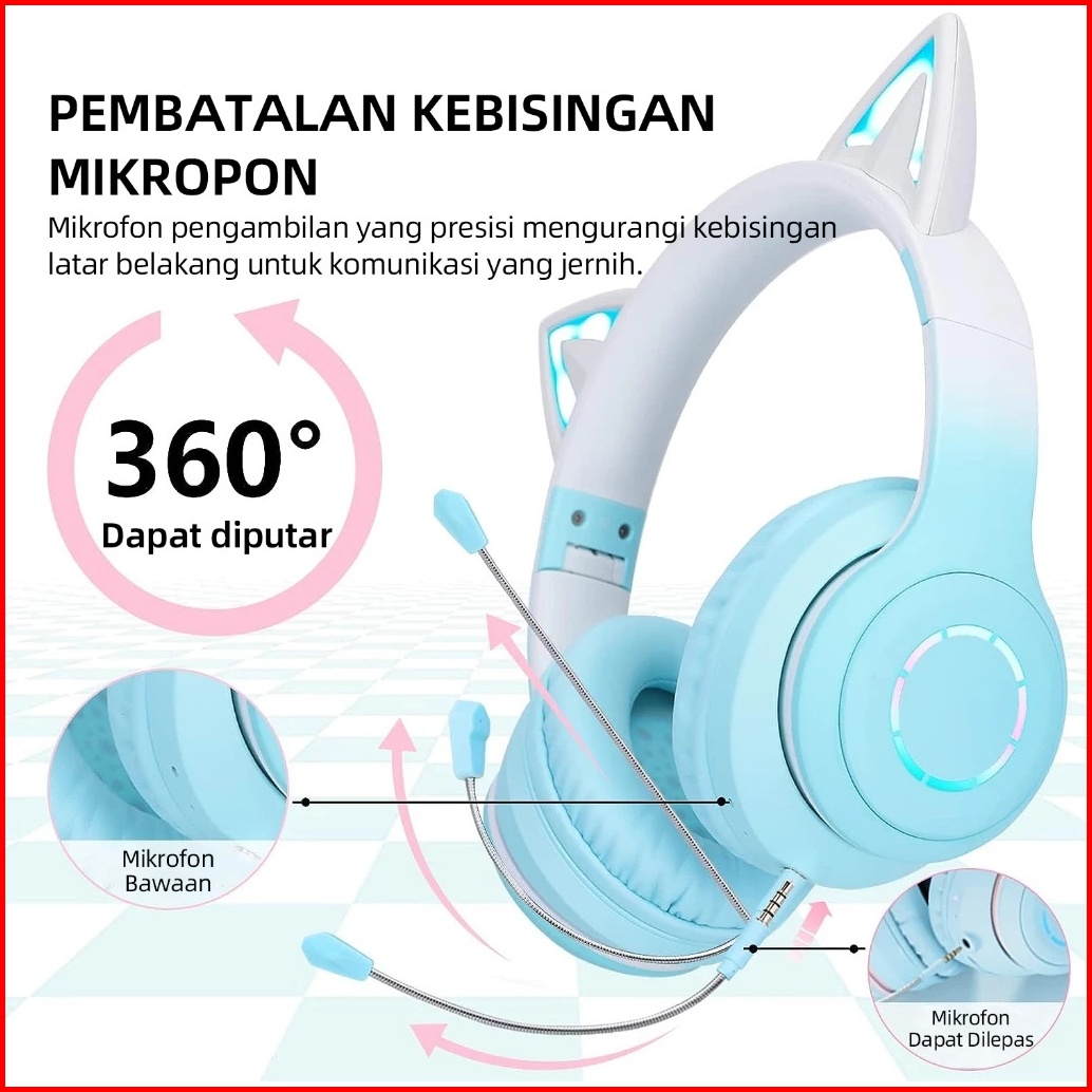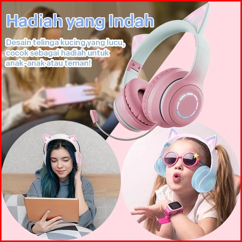Headphone Nirkabel Dengan Bluetooth 5.3 Headphone Gaming Telinga Kucing Headphone Olahraga Headphone Berkabel Pencahayaa