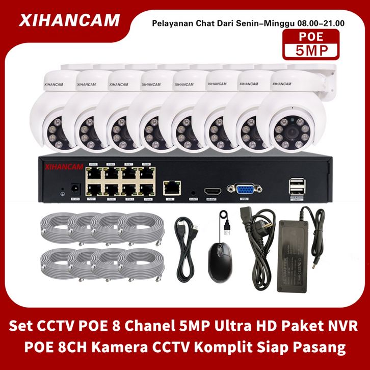 XIHANCAM Set CCTV POE 8 Chanel 5MP Ultra HD Paket NVR POE 8CH Kamera CCTV Komplit Siap Pasang