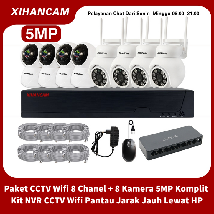 XIHANCAM Paket CCTV Wifi 8 Chanel + 8 Kamera 5MP Komplit Kit NVR CCTV Wifi Pantau Jarak Jauh Lewat HP