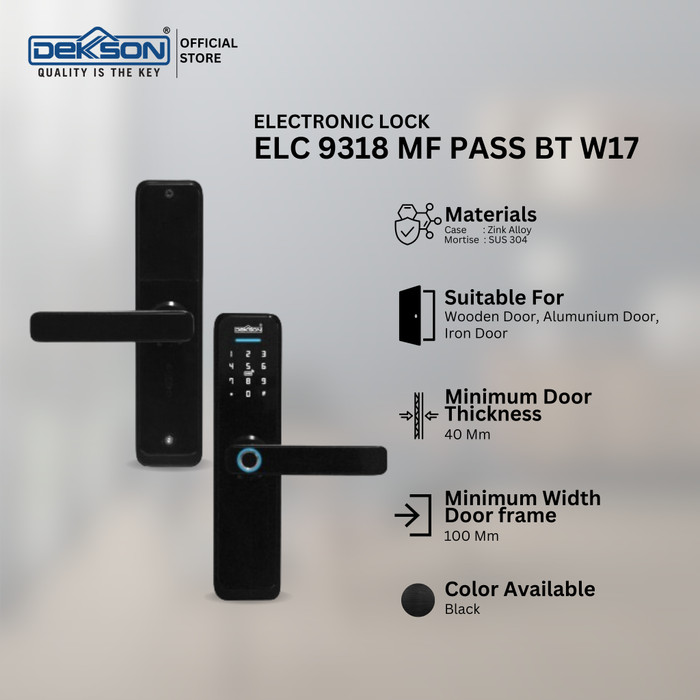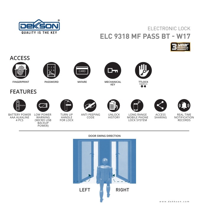 ELECTRONIC LOCK DEKKSON ELC 9318 MF FIN PASS BT (L) BK W17/ GAGANG - W17 TTLOCK LEFT