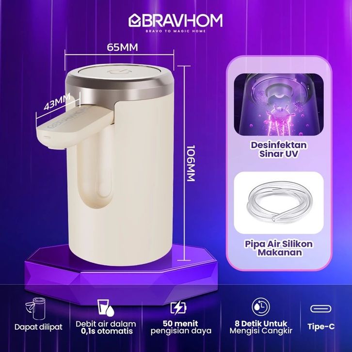 BRAVHOM Pompa Galon Electric Dapat Dilipat Desinfektan SinarUv USB Dispenser Portable Galon Air WD02 Premium 2025