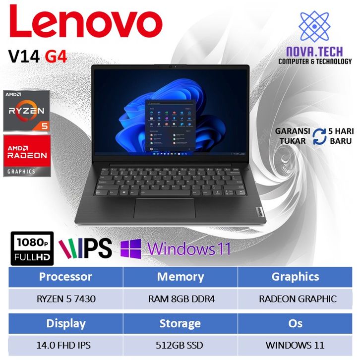 Lenovo V14 G4 7430 Laptop murah Ryzen 5 Ram 8gb 512gb Ssd layar 14.0 fhd Windows 11