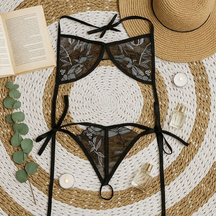 Lingerie Wanita Sexy Bikini Malam Transparan Bunga Bordir Set Tali Sisi Lace Bra dan Thongs Bikini B11