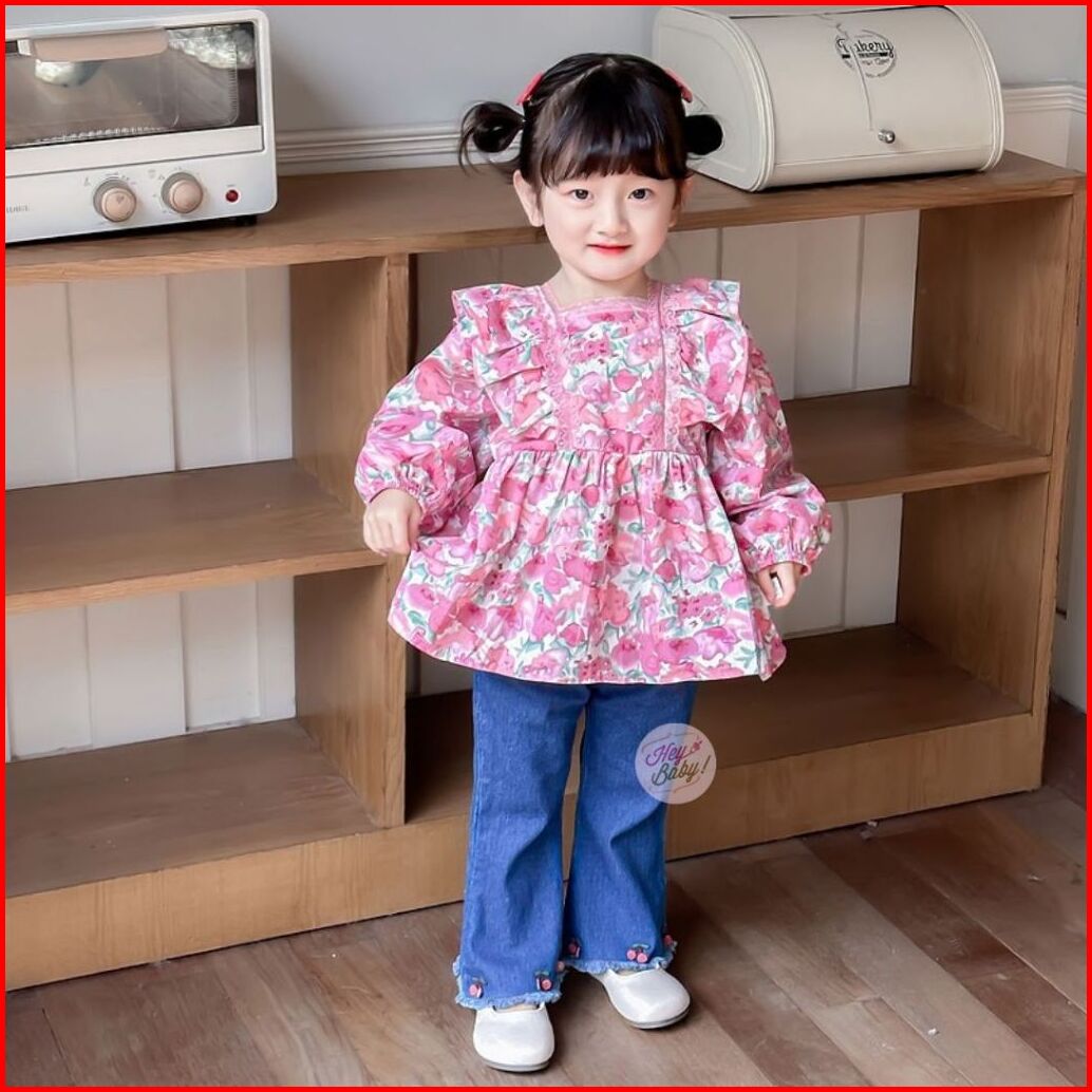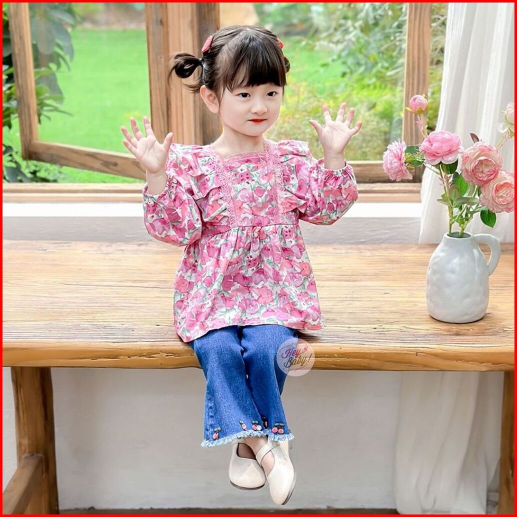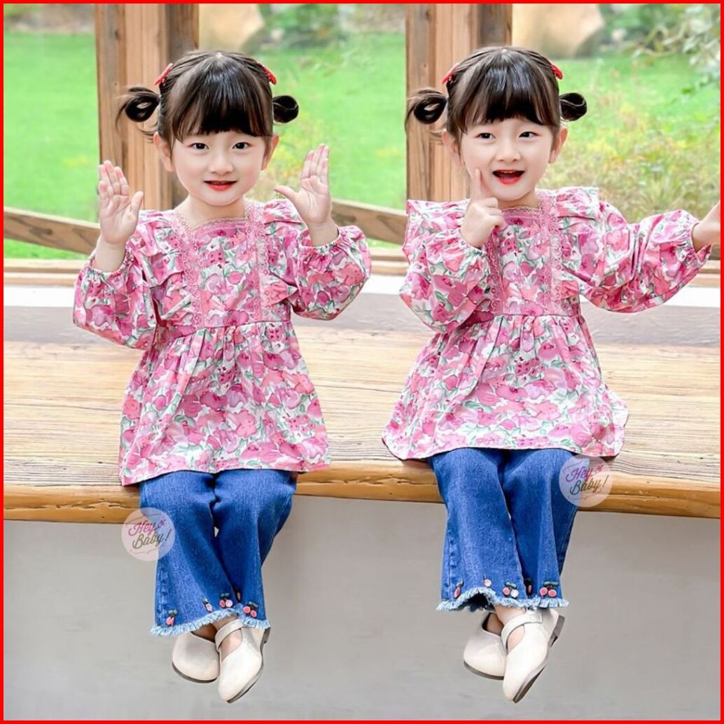 Promo 10.10 Heybaby Set Cherry Denim Ebv Baju Setelan Anak Perempuan Celana Denim 1-6 Tahun Motif Bunga