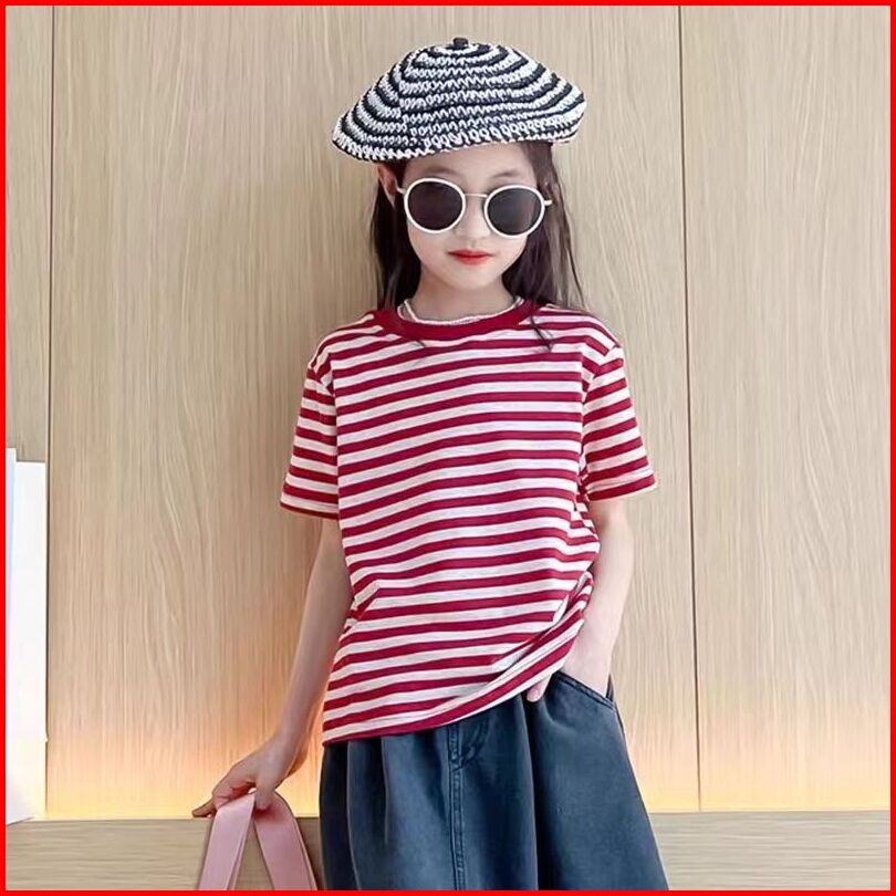 Korea Style Setelan Anak Perempuan One Set Setelan Jeans Anak Cewek T-shirt Garis-garis Merah Rok Jeans Panjang Color Gr