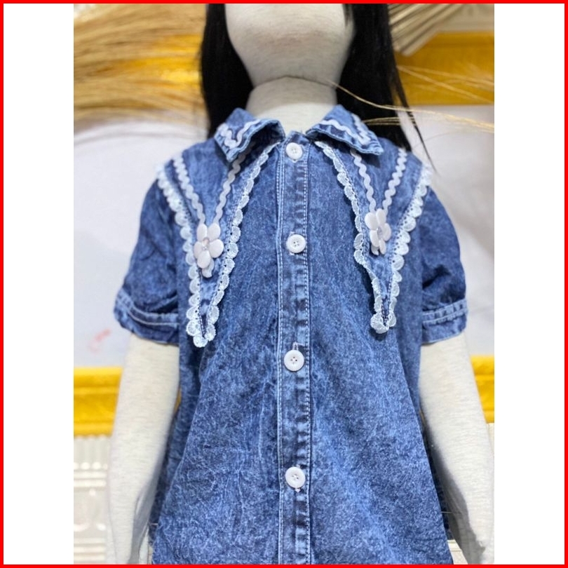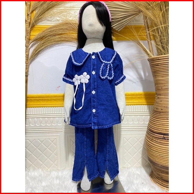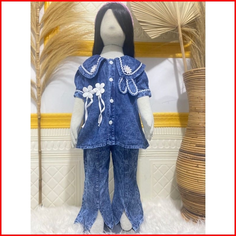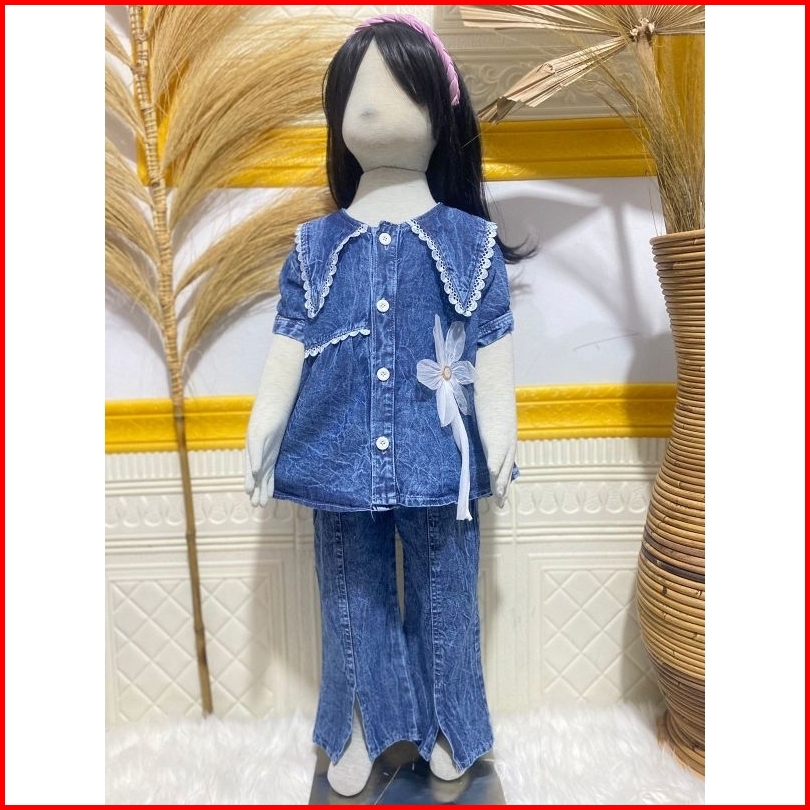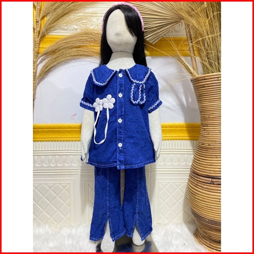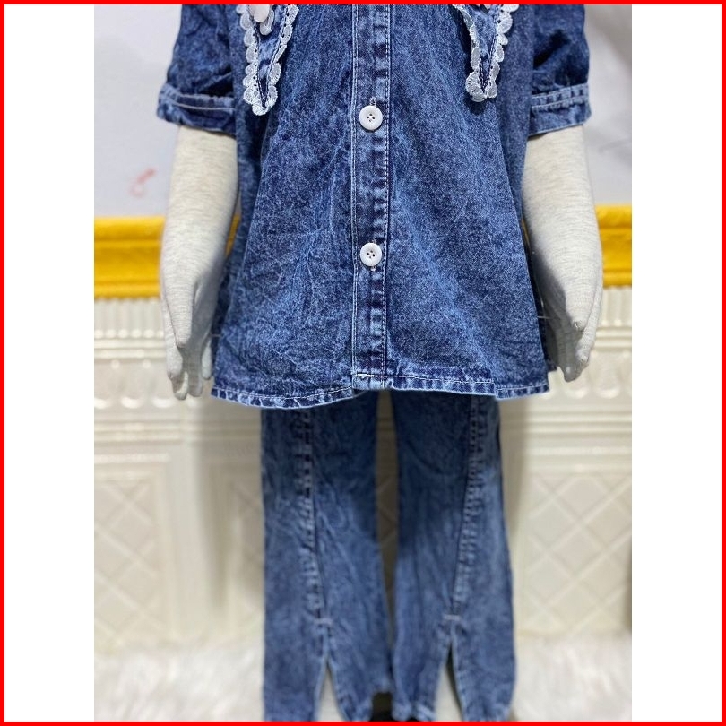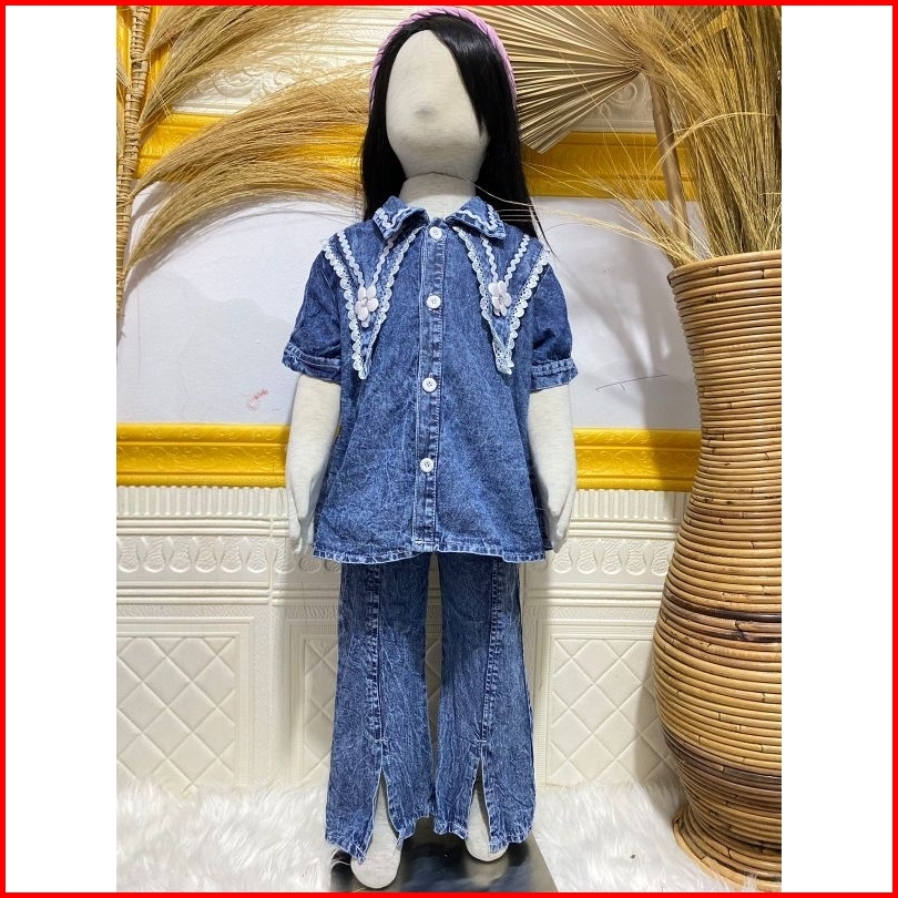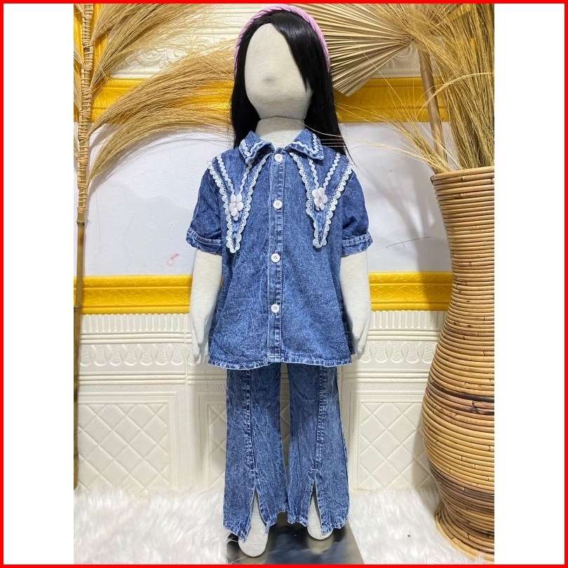 Setelan Kemeja Full Jeans Celana Cutbray Anak Perempuan Usia 3 Tahun - 12 Tahun Baju Stelan Renda Jeans Anak Perempuan O