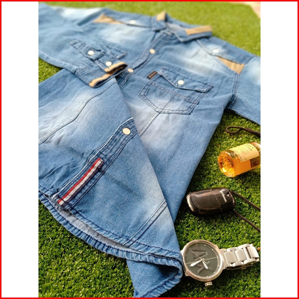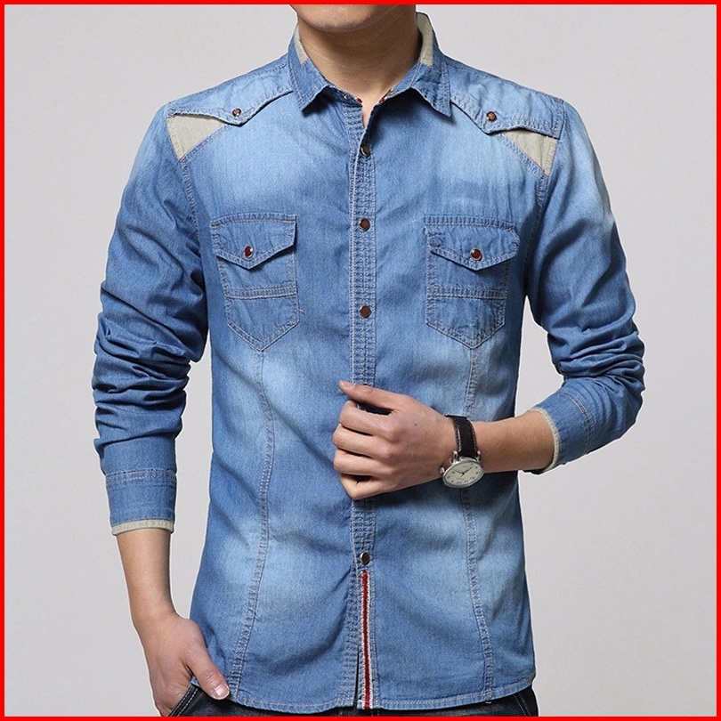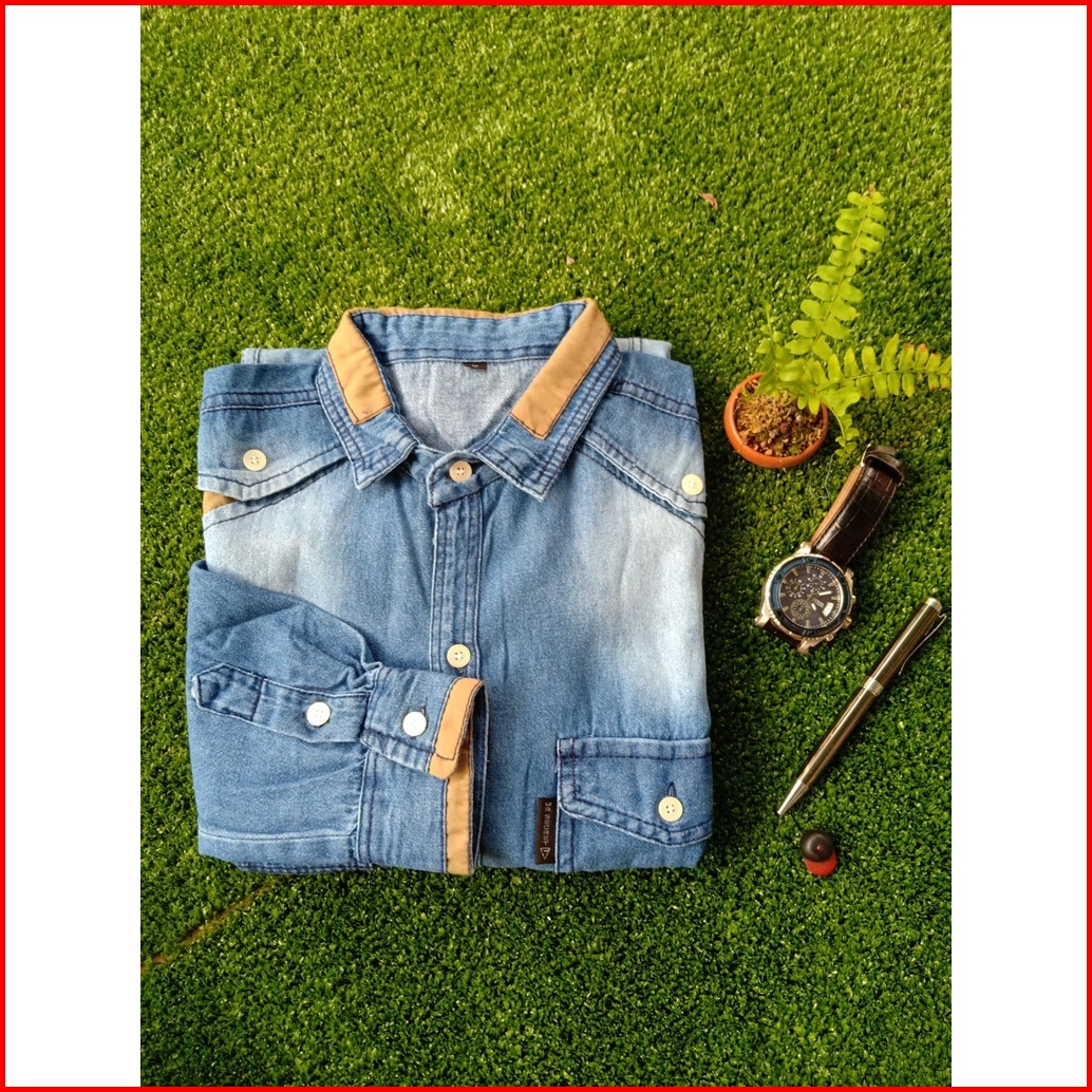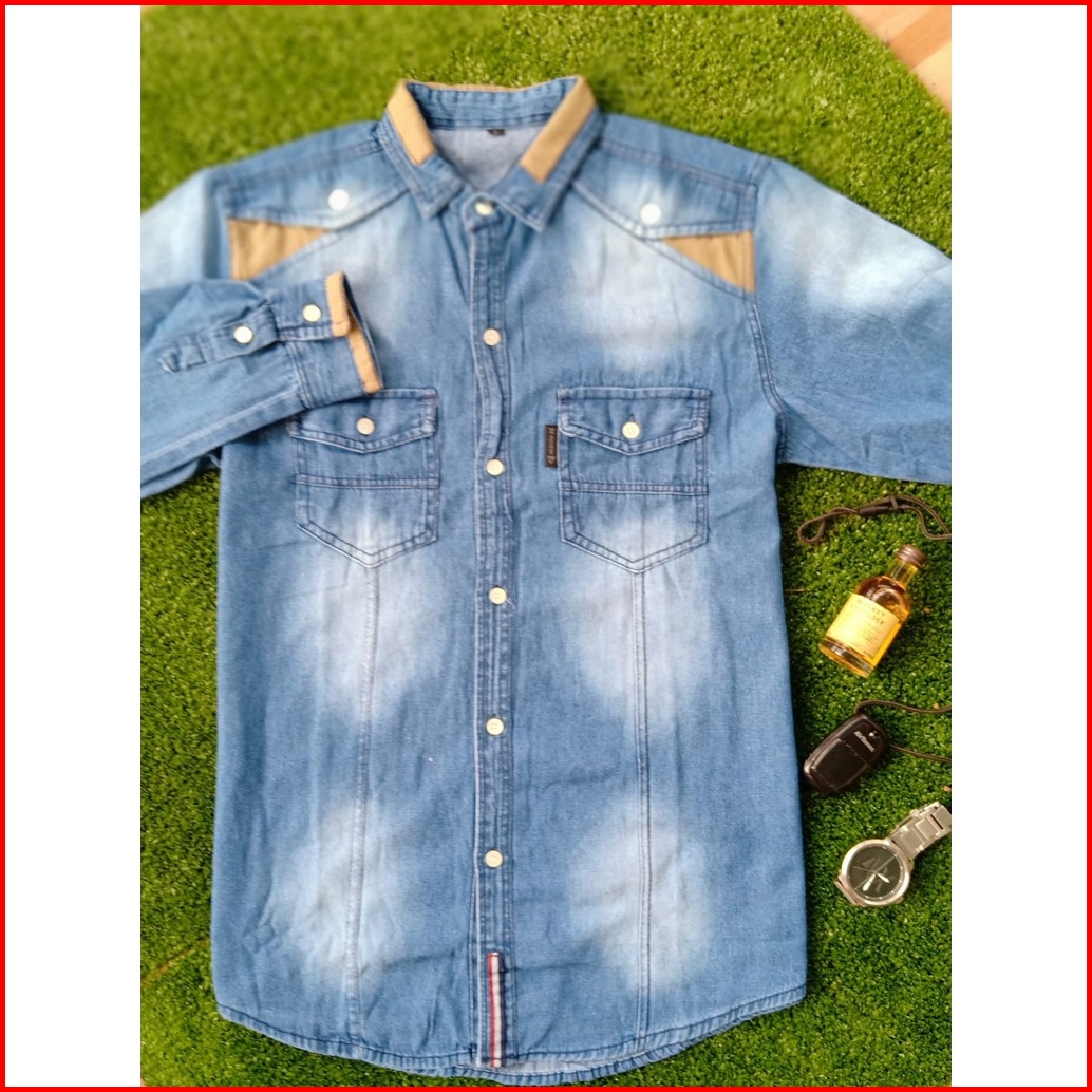Axton Kemeja Pria Lengan Panjang Jeans Wash Denim Kombinasi Kerah Semi-slimfit Formal Modis Keren Stylish Halus Terlaris