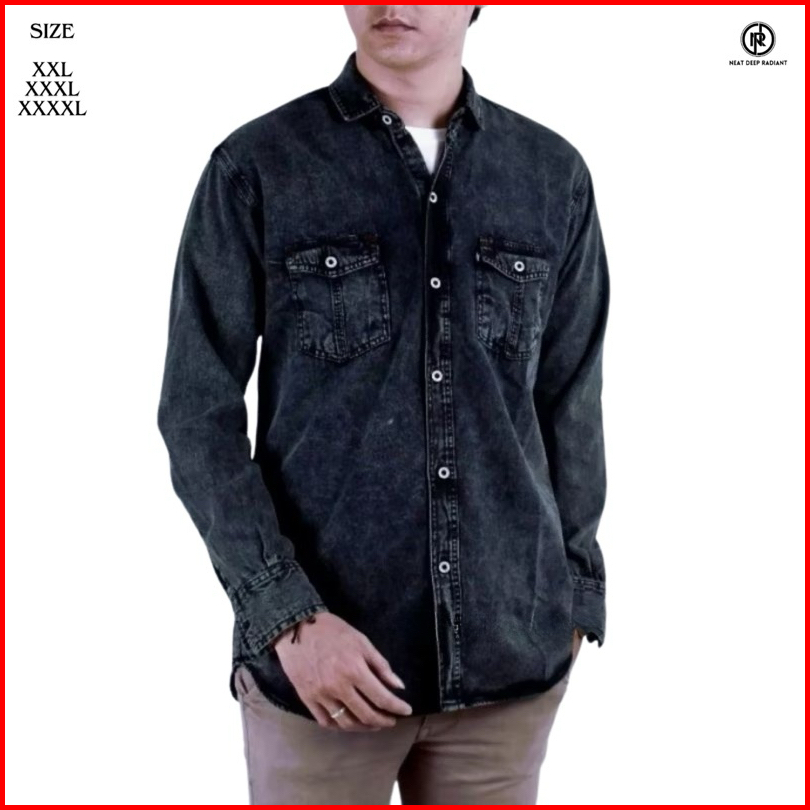 Kemeja Jeans Denim Jumbo Pria Lengan Panjang Snowblack Size Xxl -3xl-4xl