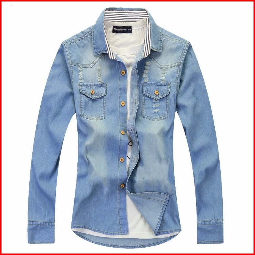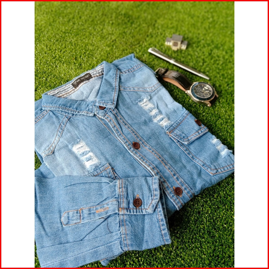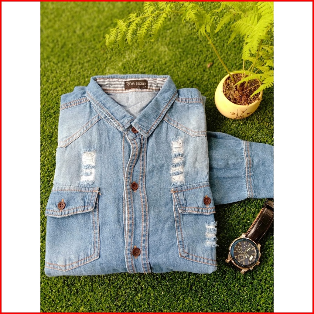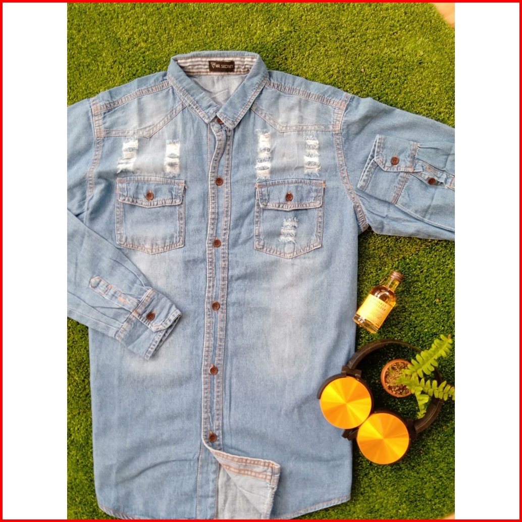 Fransisco Fashion Kemeja Jeans Pria Lengan Panjang Denim Atasan Kerah Semi-slimfit Variasi Sobek Kombinasi Salur Formal
