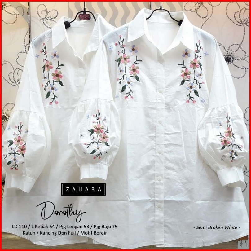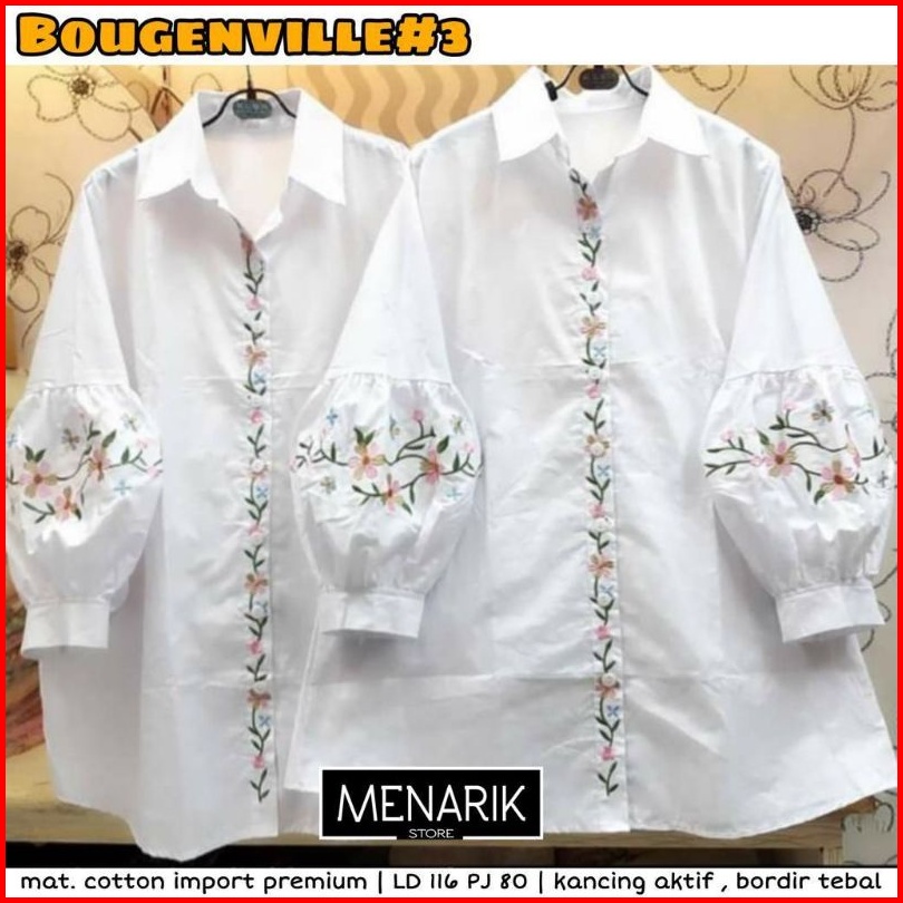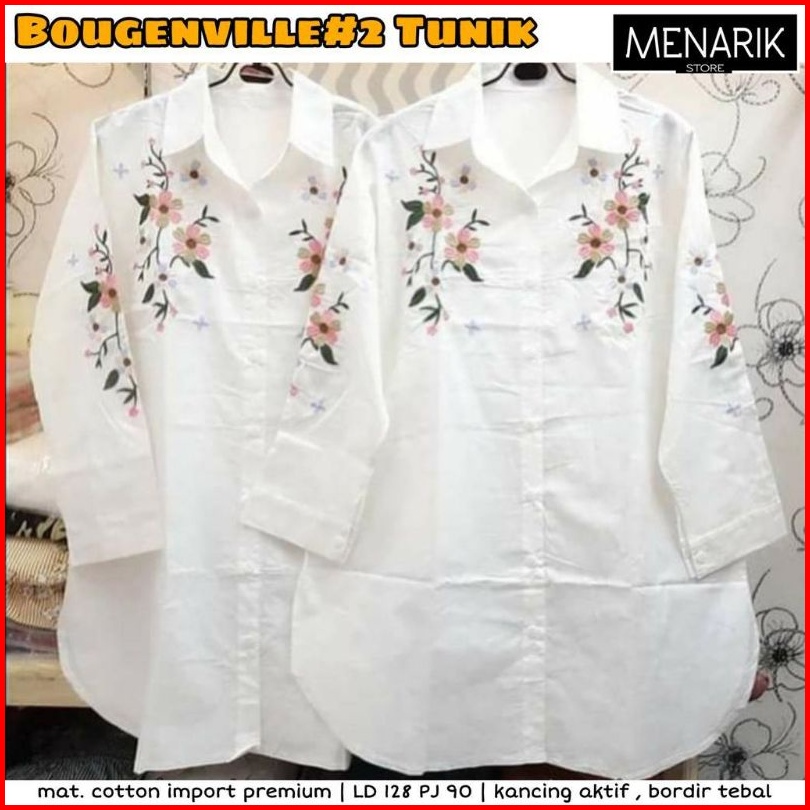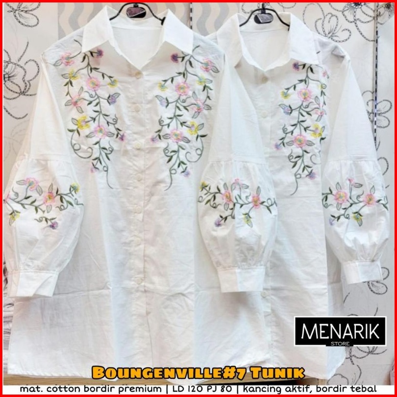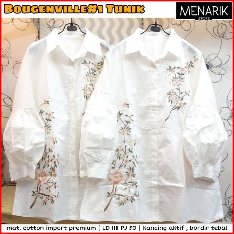 Kemeja Tunik Putih Mewah Tunic Katun Lengan Panjang Wanita Blouse Motif Bunga Bordir. Bougenville By Menarik