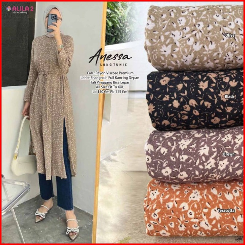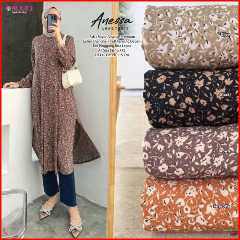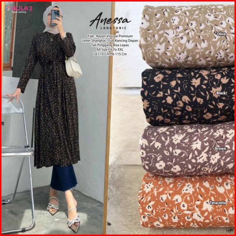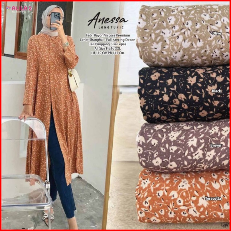 Anessa Long Tunik By Alila2. Tunik Panjang Wanita Rayon Cantik Fashion Perempuan Muslim Terkini Busui Full Kancing Depan