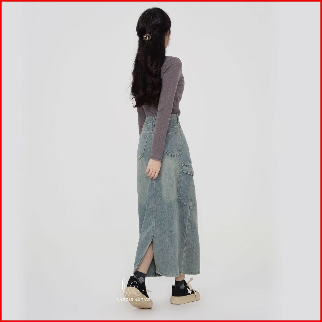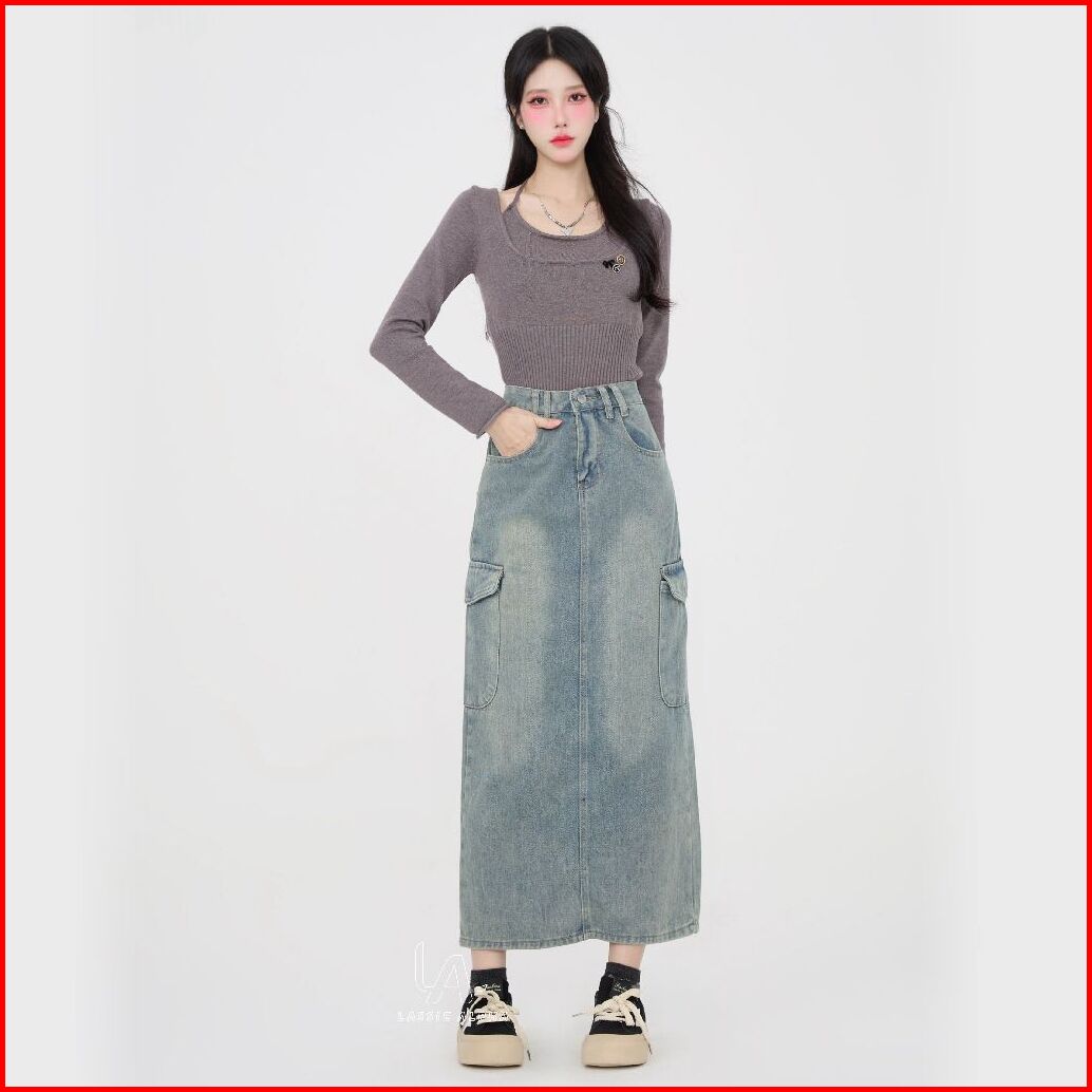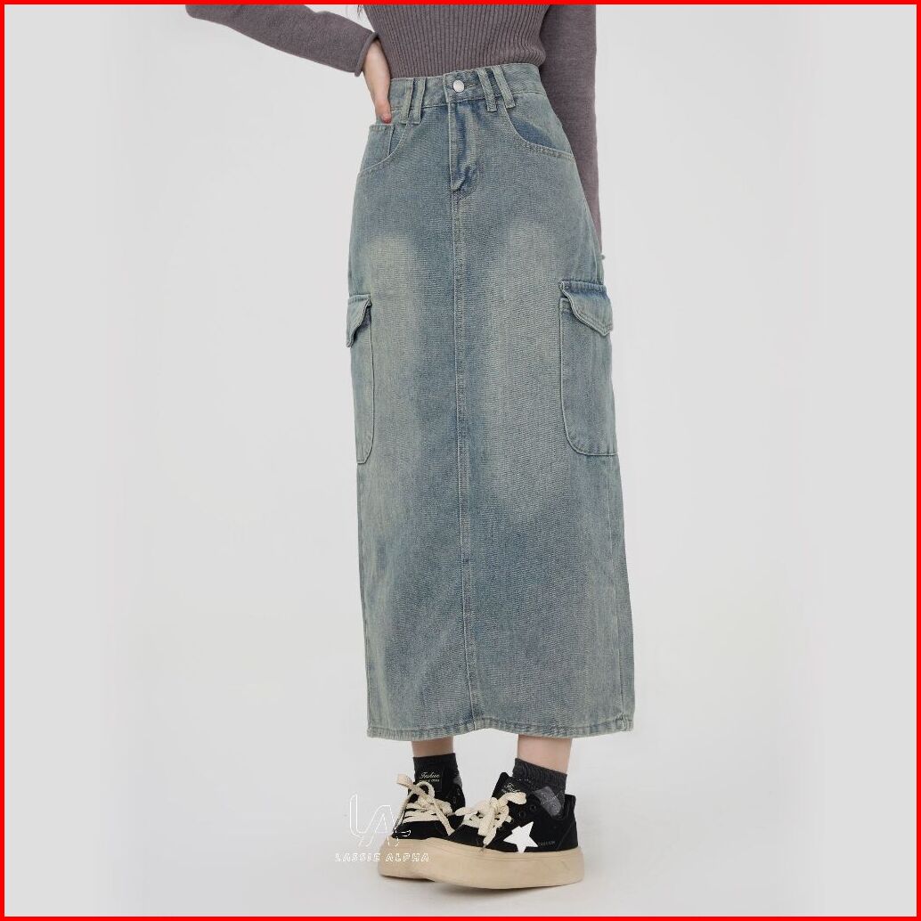 Lassie Alpha J65 Ready Stok Rok Panjang Denim Wanita Rok Biru Muda Antik Casual Rok