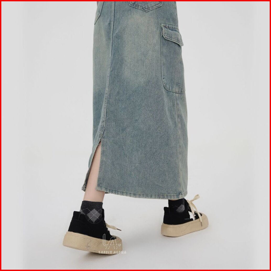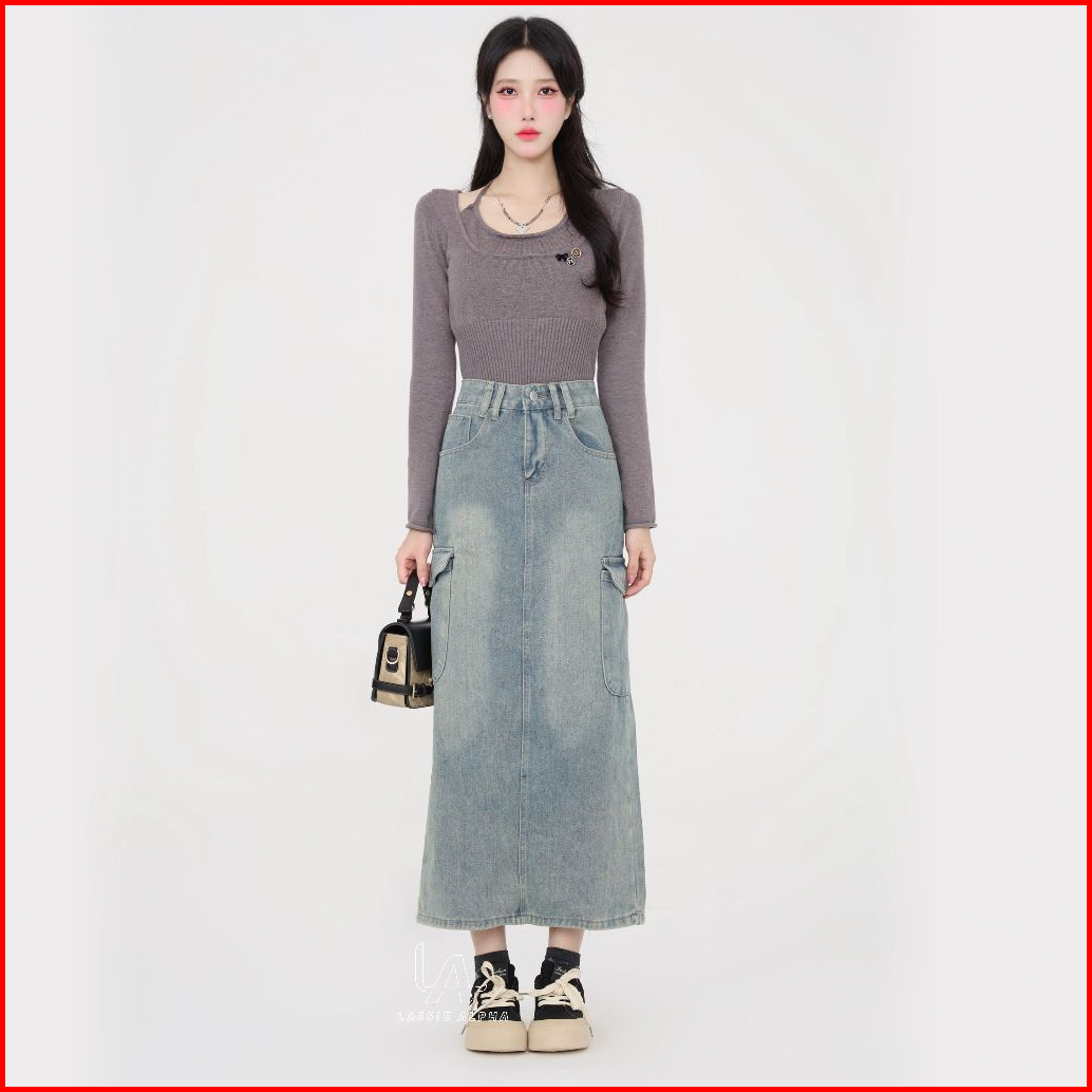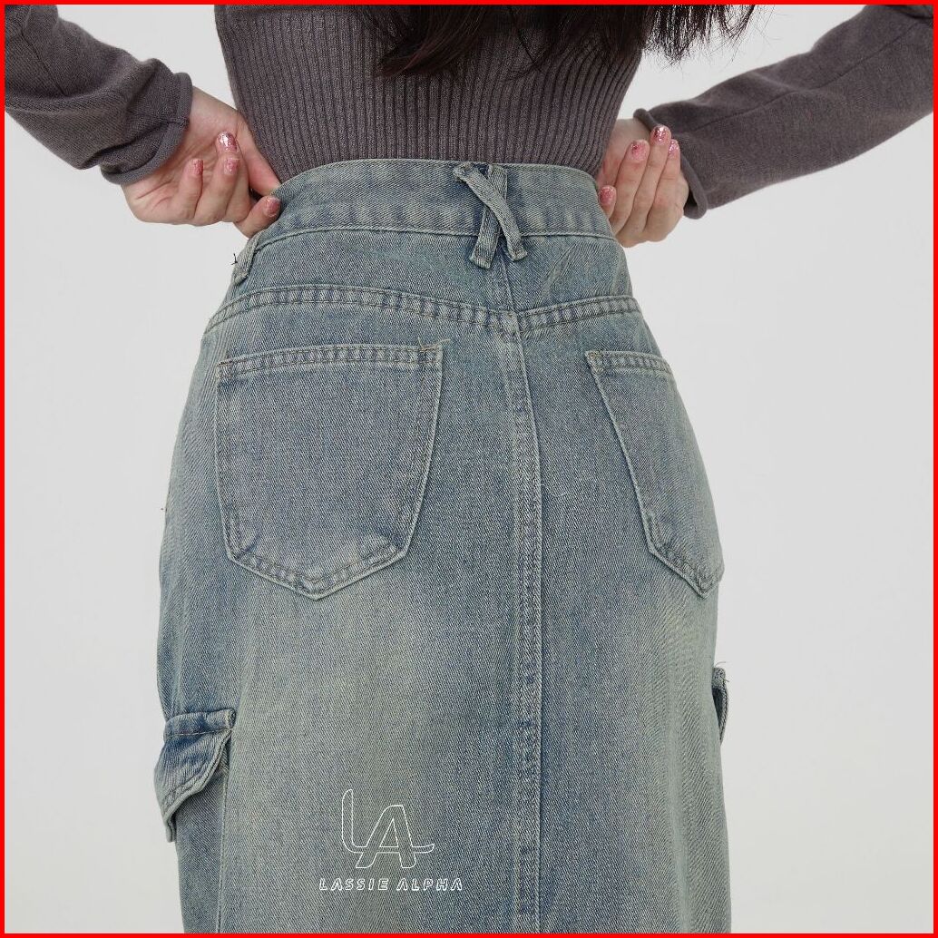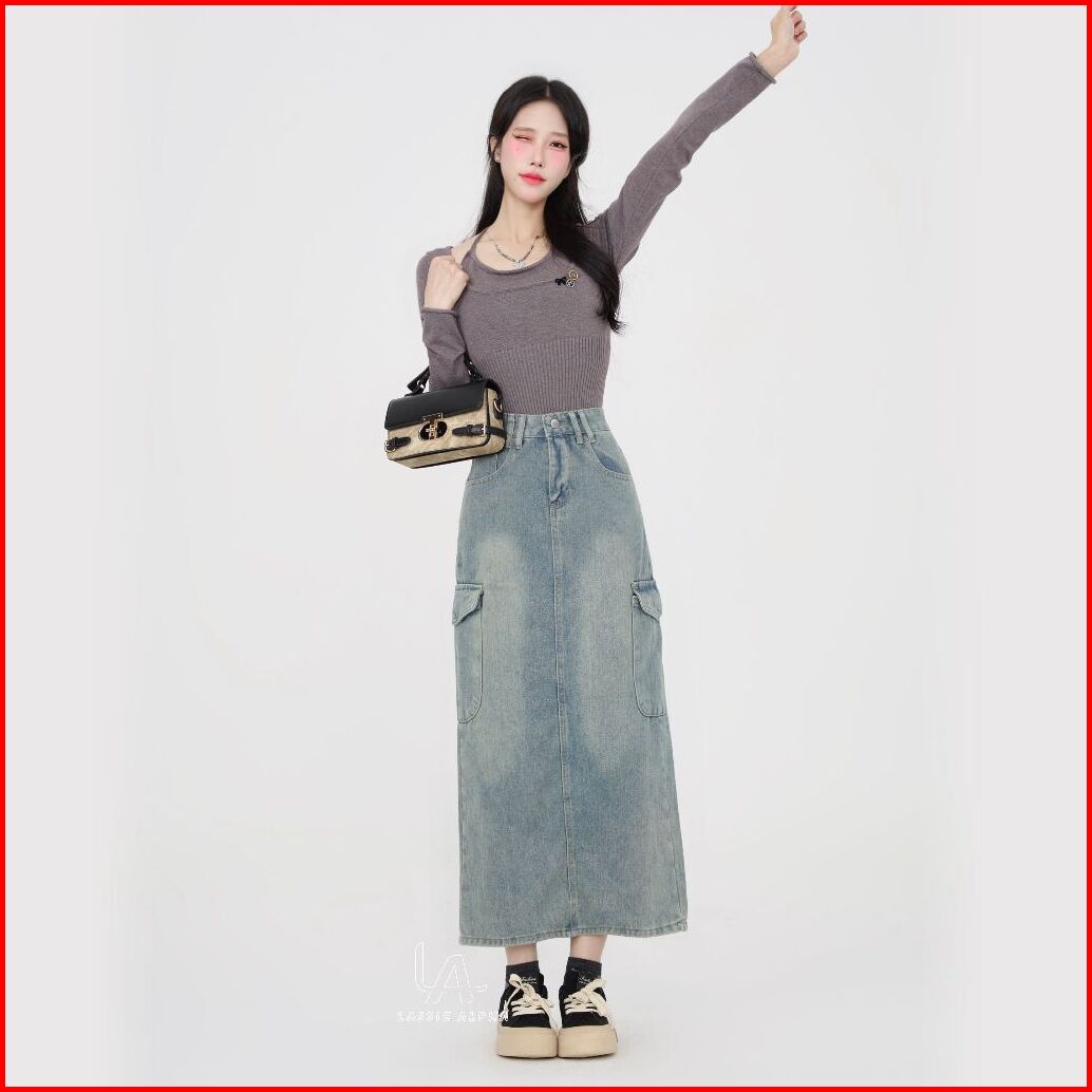 Lassie Alpha J65 Ready Stok Rok Panjang Denim Wanita Rok Biru Muda Antik Casual Rok