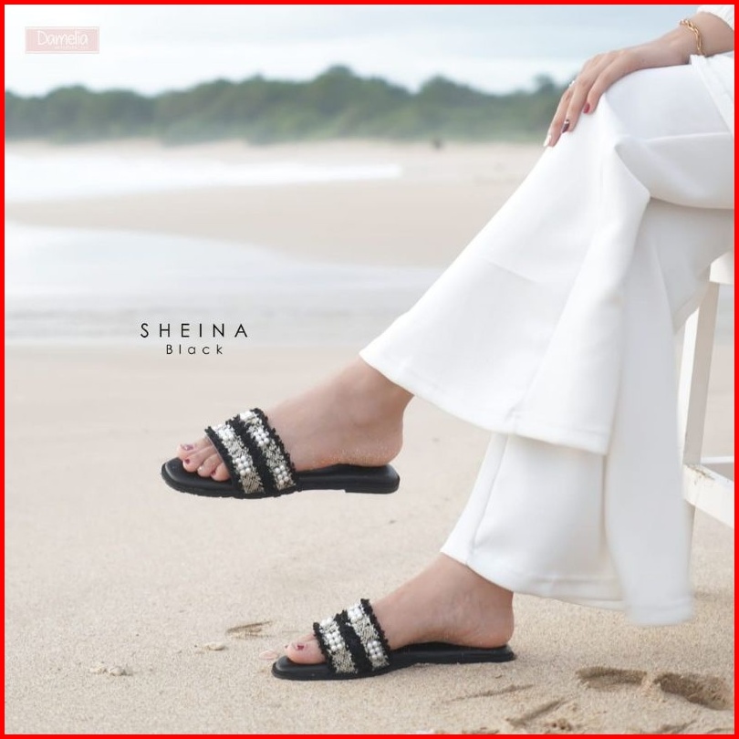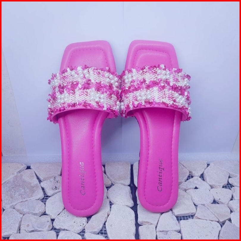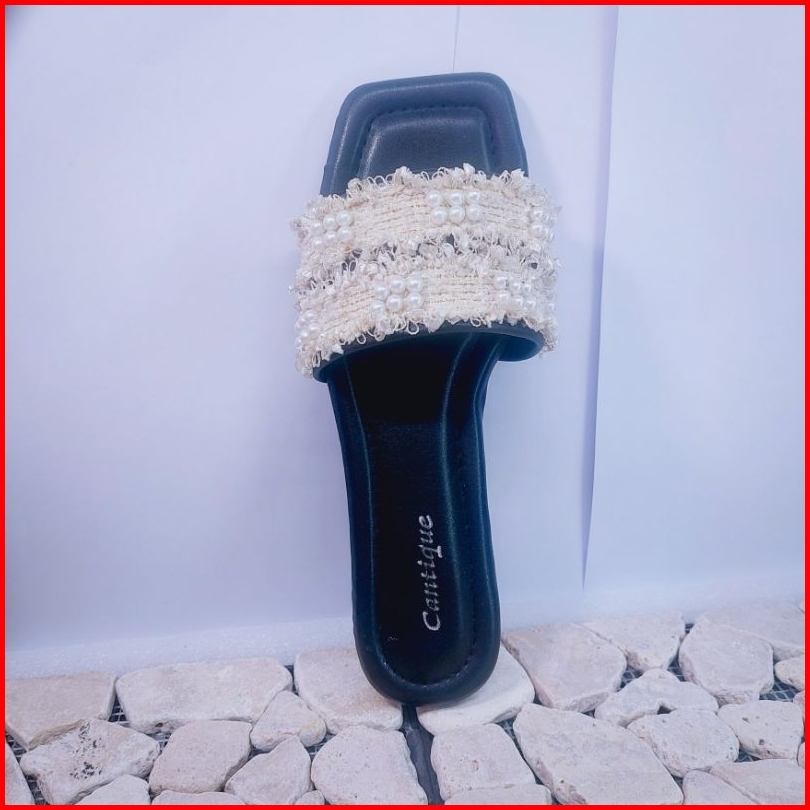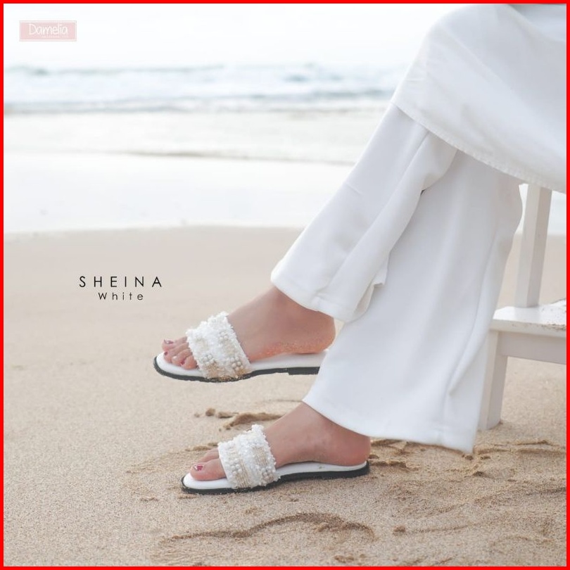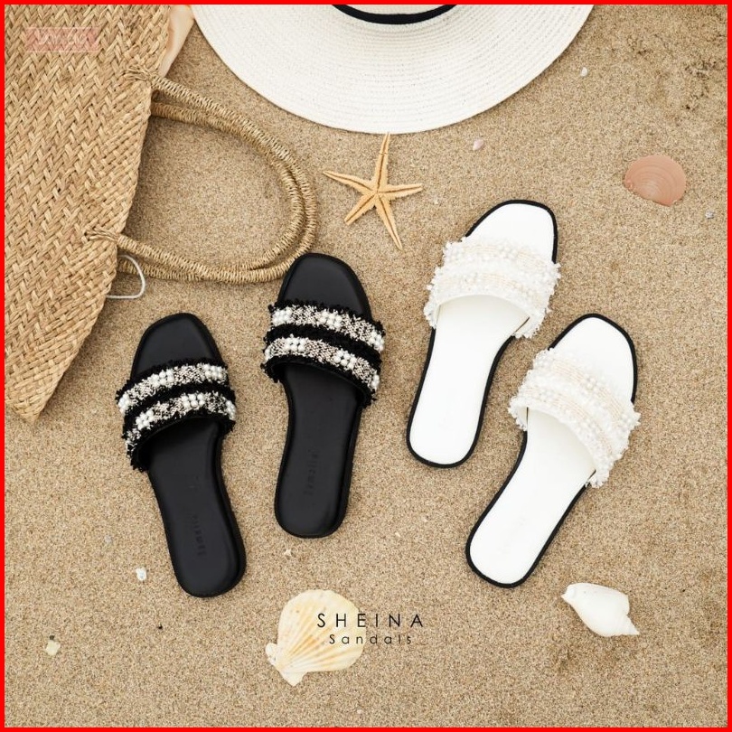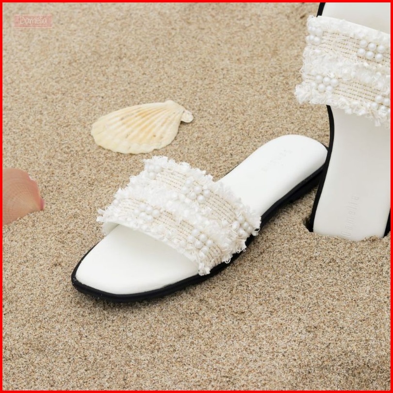 Sandal Wanita Kekinian Sheina Bludru Mute Mutiara Putih Import - Sendal Wanita Empuk Terbaru