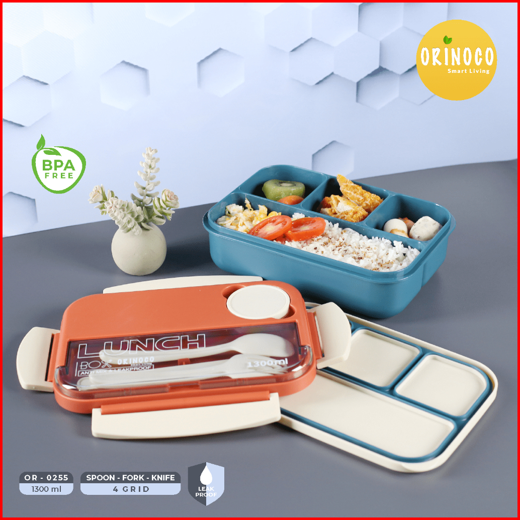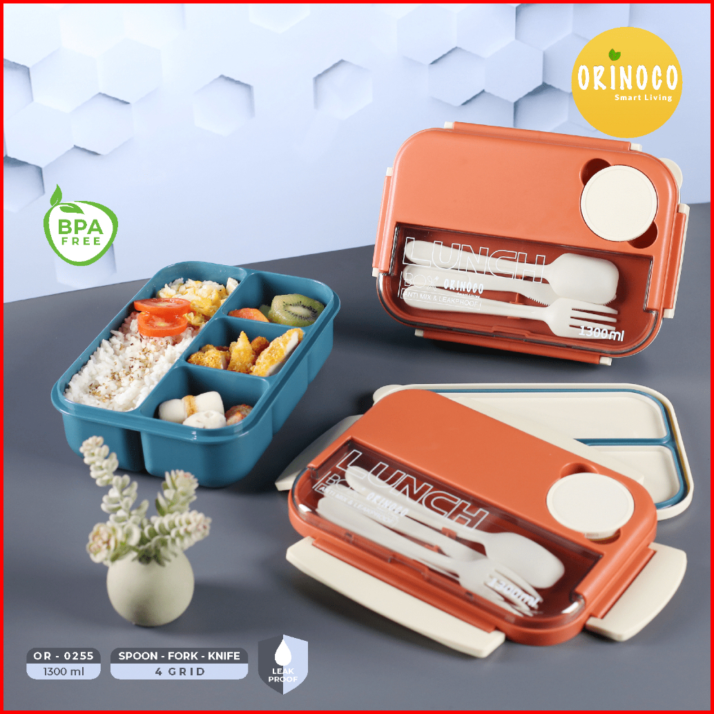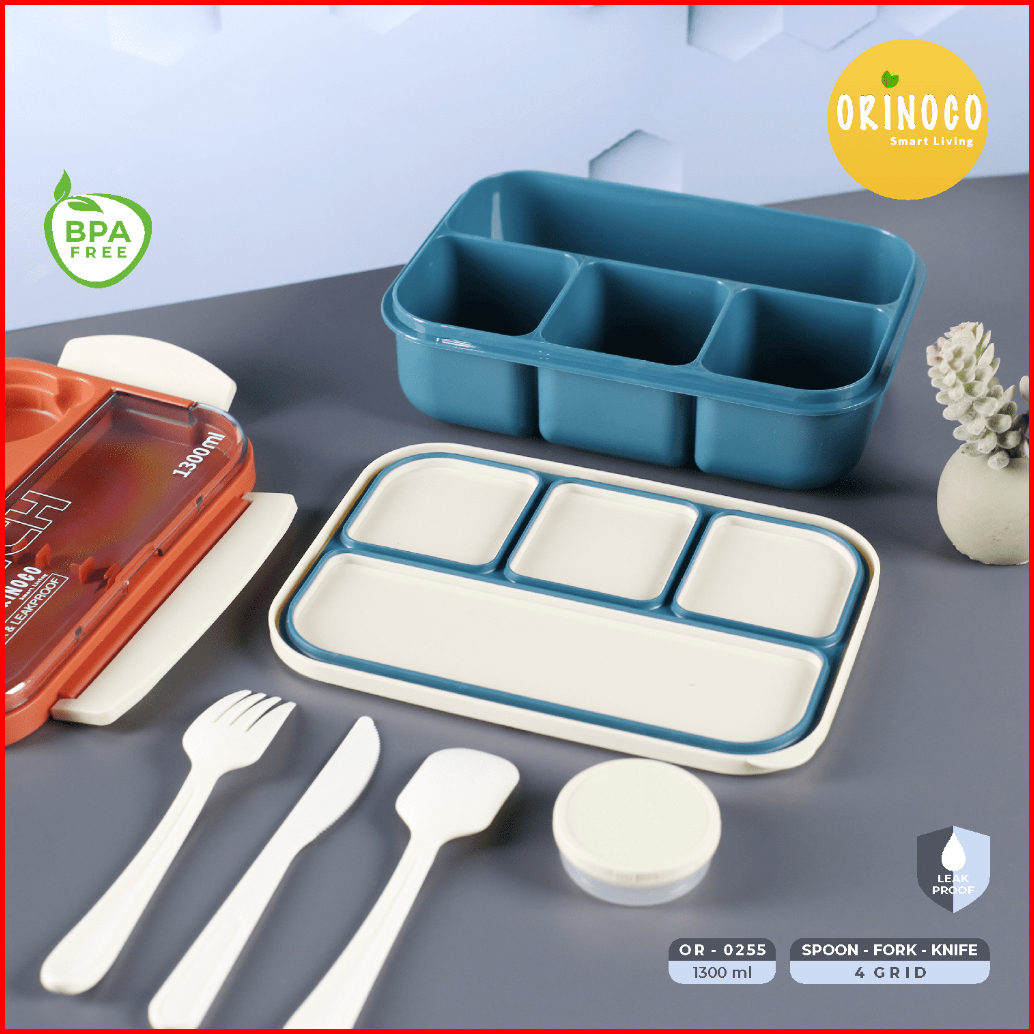 Orinoco Kotak Makan 4 Sekat Anti Tumpah 1300 Ml Include Wadah Sup Free Sendok Garpu Pisau Or-0255
