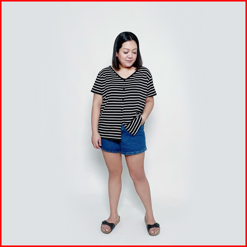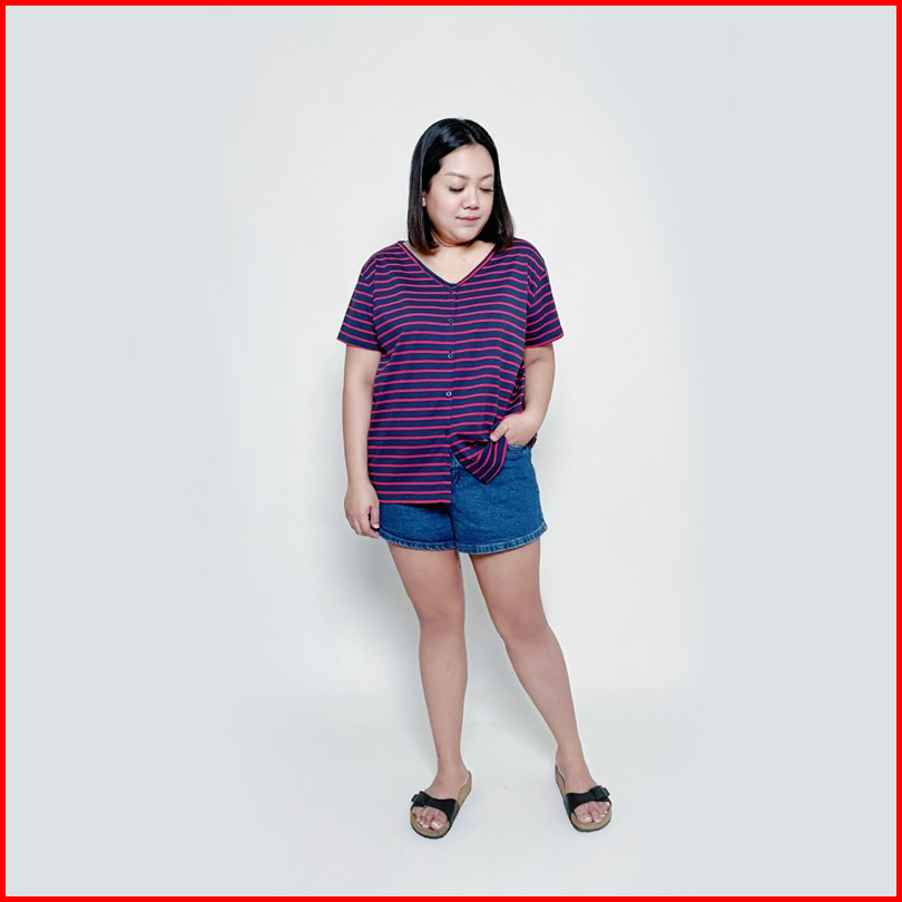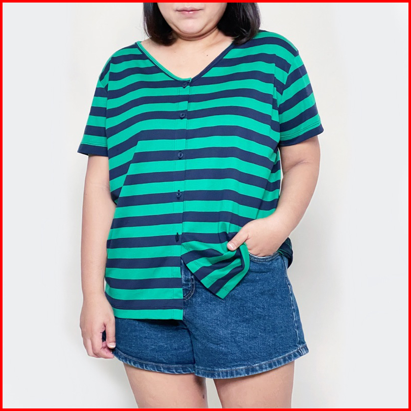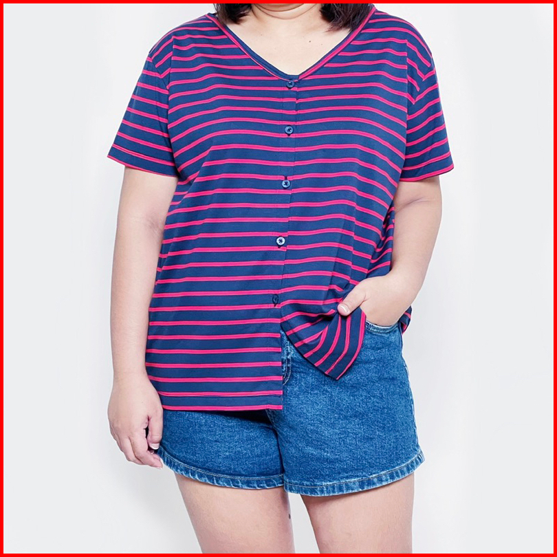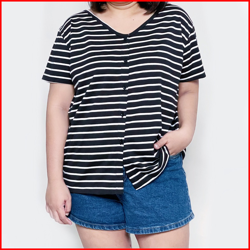 Kaos Bigsize Jumbo Wanita - Vneck Button Stripe Tshirt