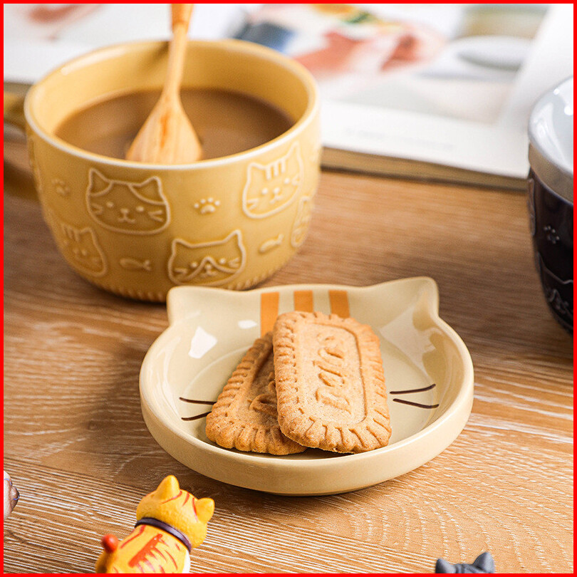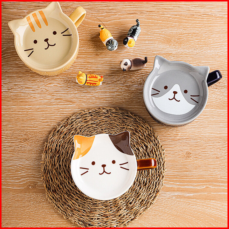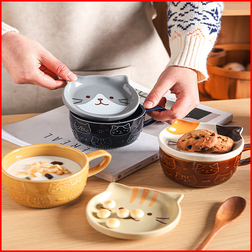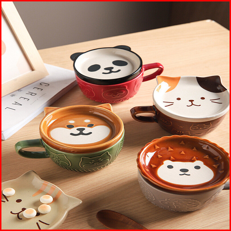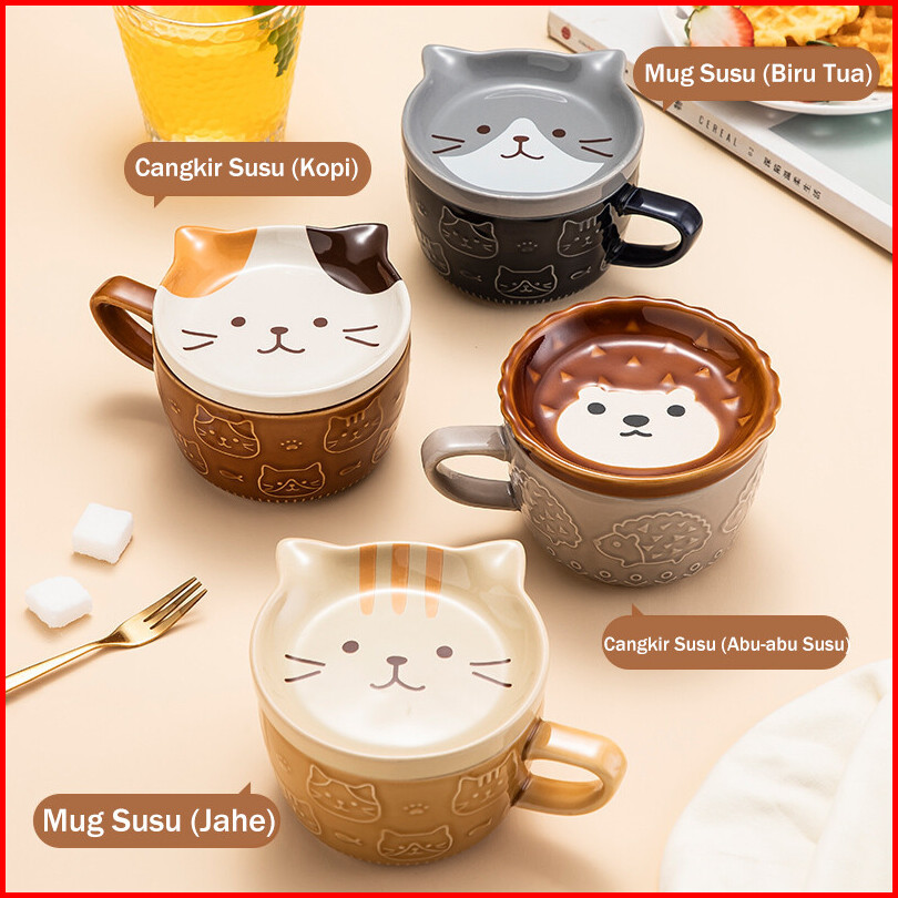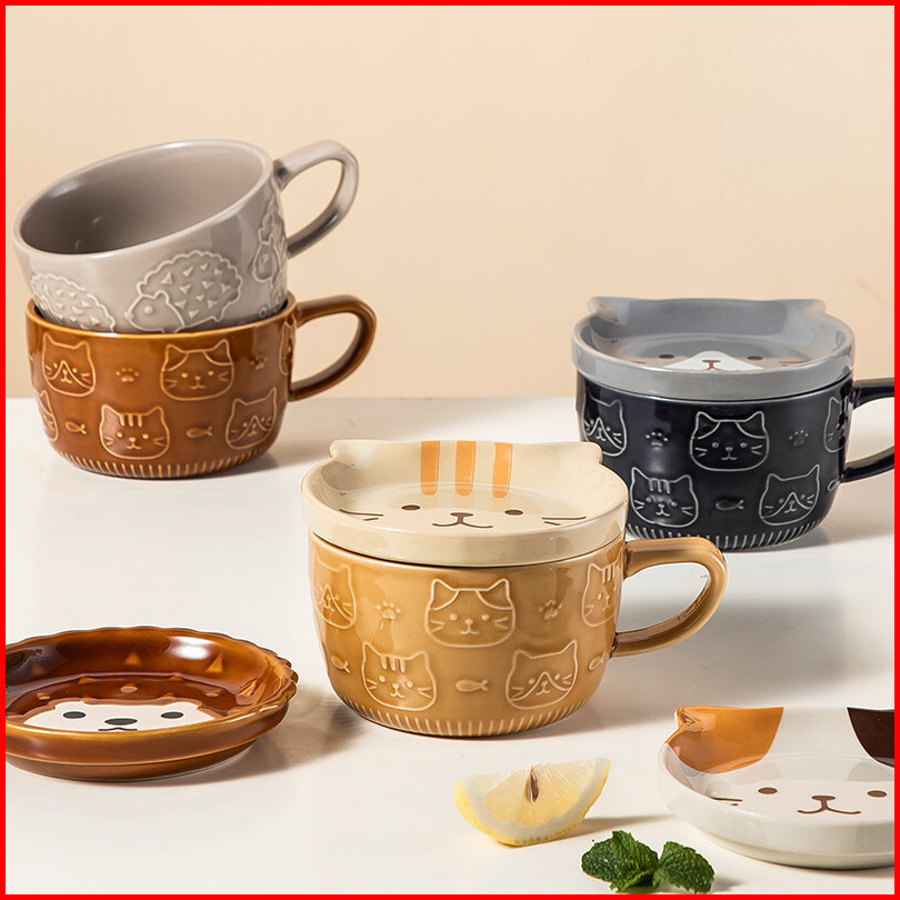 Ready Stock Mug Keramik Kartun 5 Warna Brown Cat Coaster Mug Set Mug Cartoon Kopi Keramik Dengan Tutup Mug Sarapan Lucu