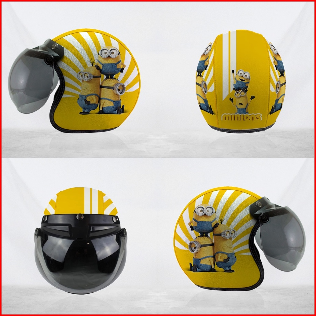 Helm Bogo Retro Dewasa Dan Anak Kulit Motif Minions Kuning Putih Kaca Bubble Smoke Sni Hallface