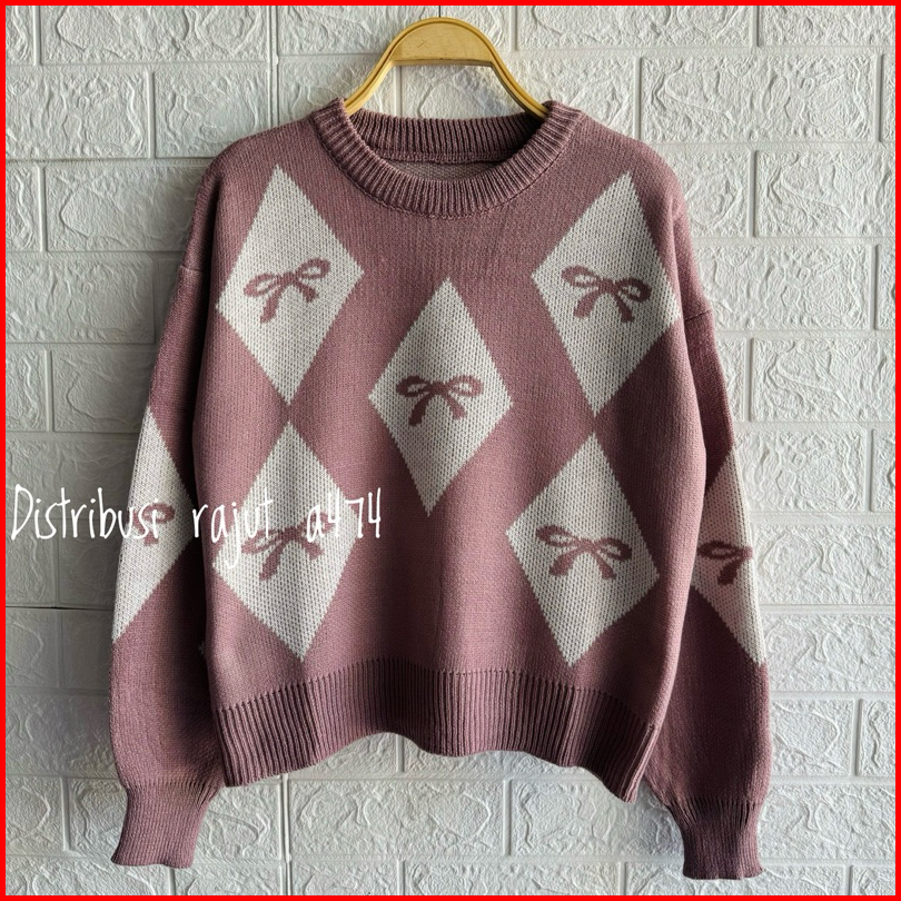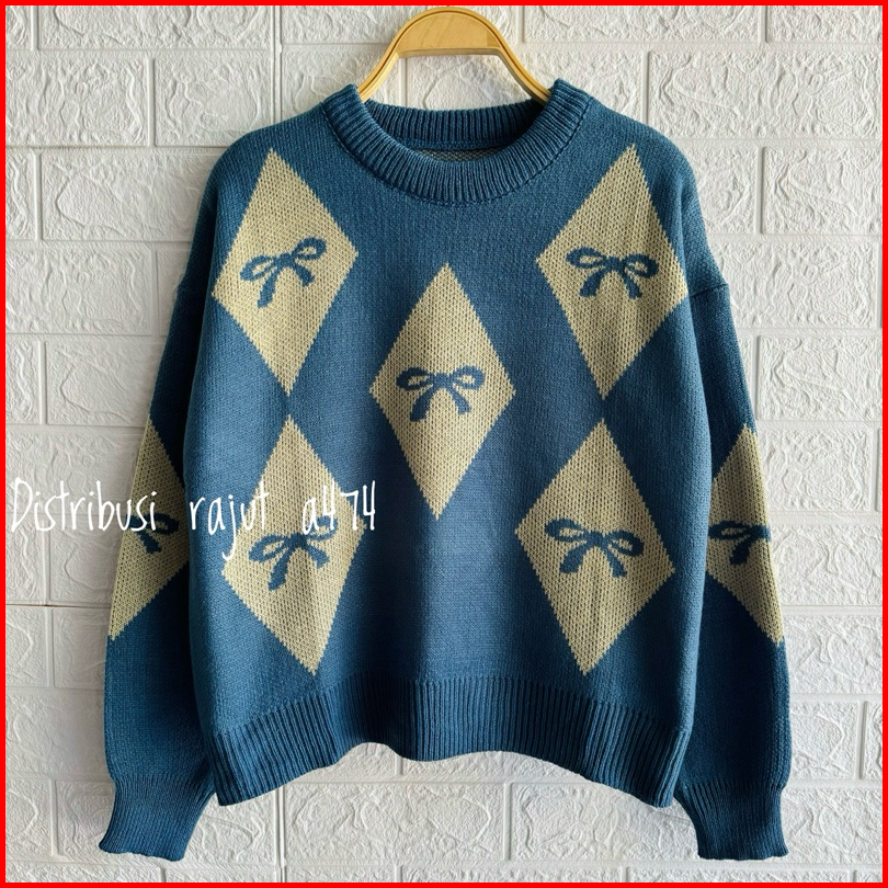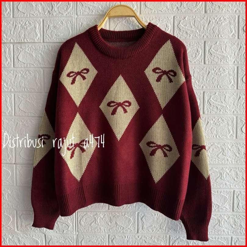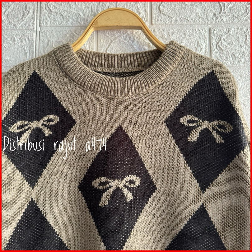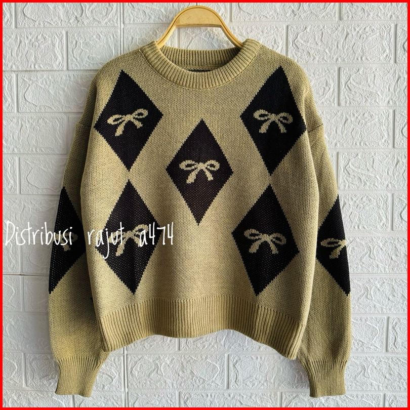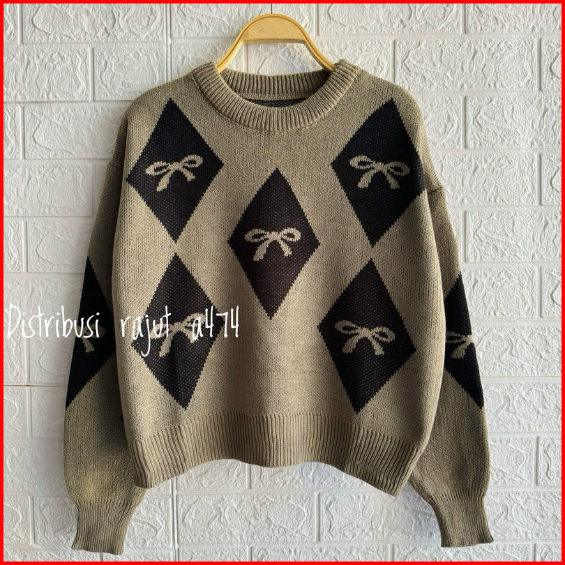 Evelyn Atasan Knitwear Crop Baju Sweater Rajut Motif Pita Ketupat Wanita Korea Premium Tebal Kekinian