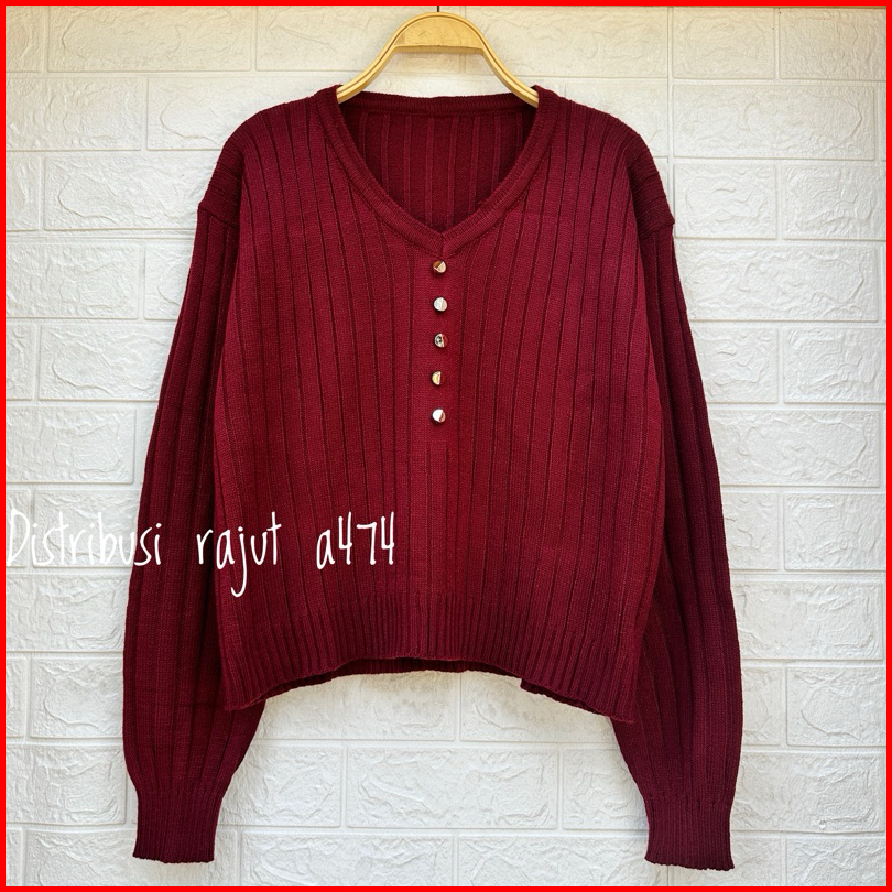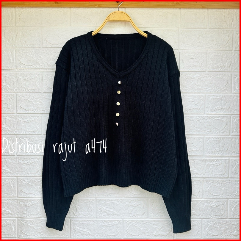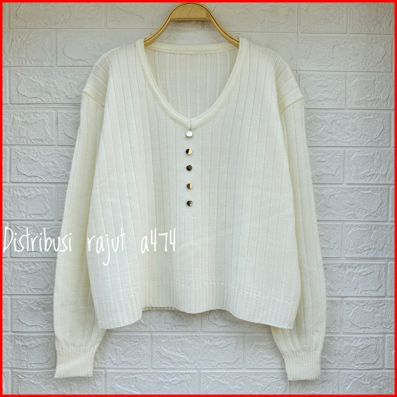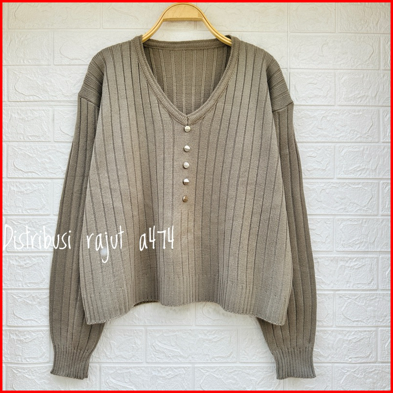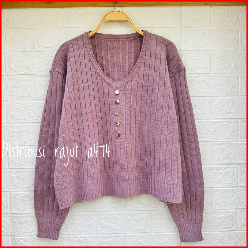 Adela V Neck Baju Atasan Sweater Rajut Wanita Motif Salur Kancing Wanita Lengan Panjang