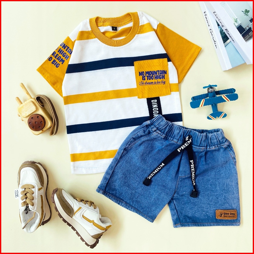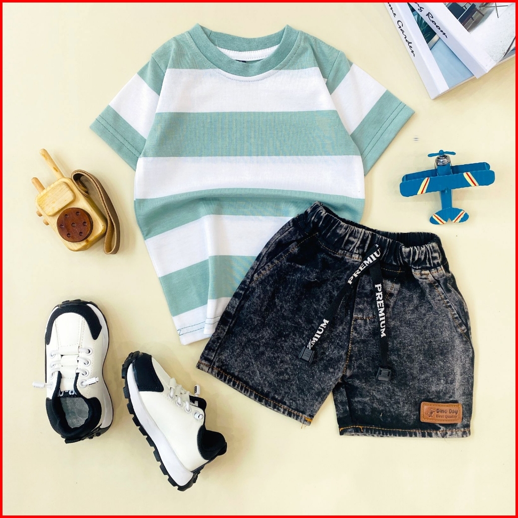 Estishop Setelan Baju Anak Laki Laki Kaos Salur Katun 30s Stripe Bayi Celana Jeans Pendek Fashion