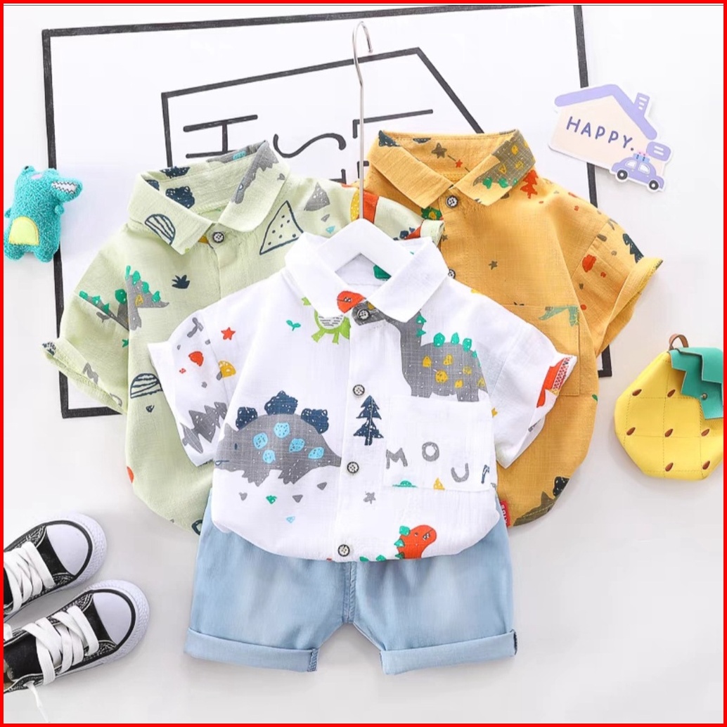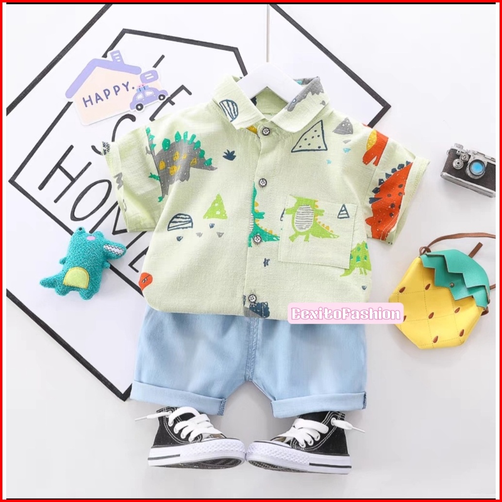 Eexito Setelan Kemeja Motif Dino Celana Jeans Fashion Anak Setelan Anak Laki Laki One Set Anak