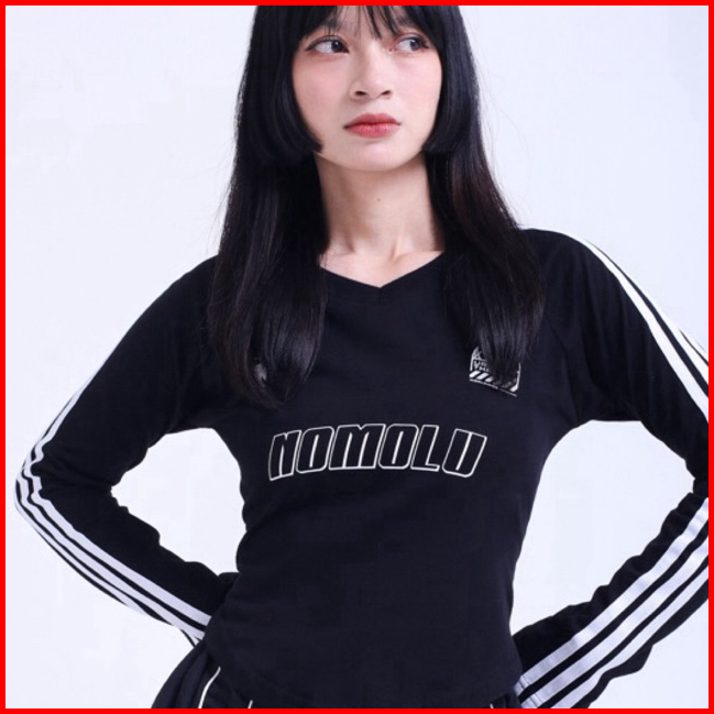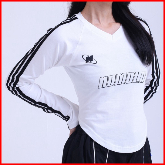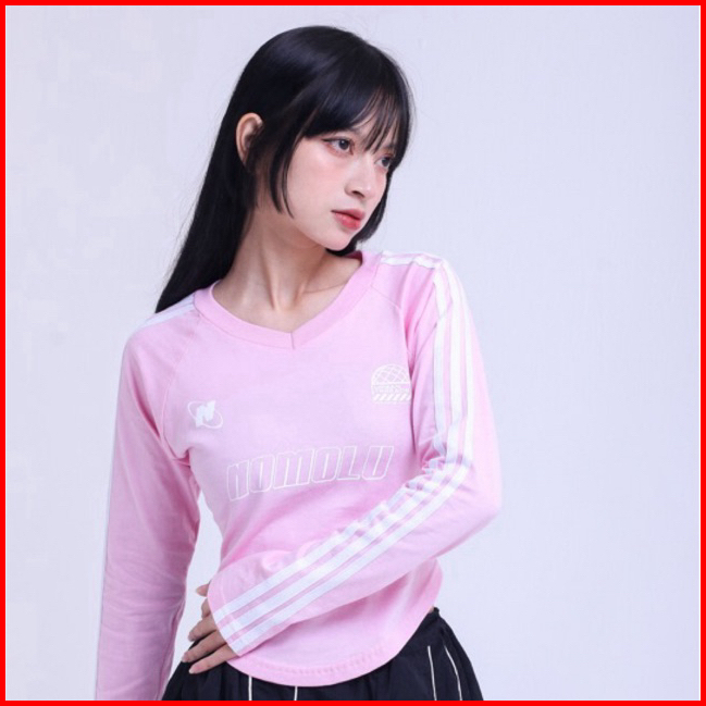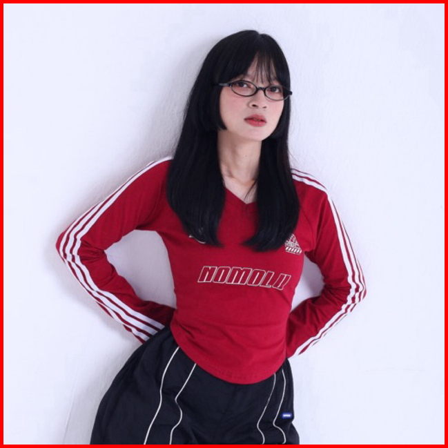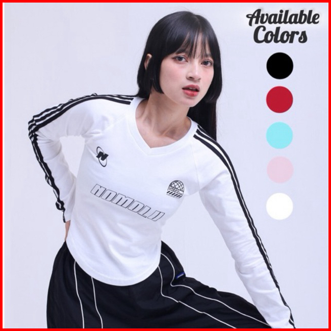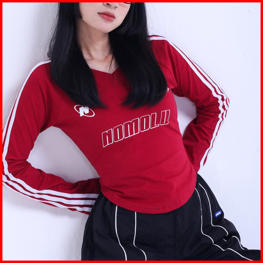 Nomolu - Croptop Long Sleeve Baju Wanita Lengan Panjang V-neck - Casual Basic Polos Kaos Stripe