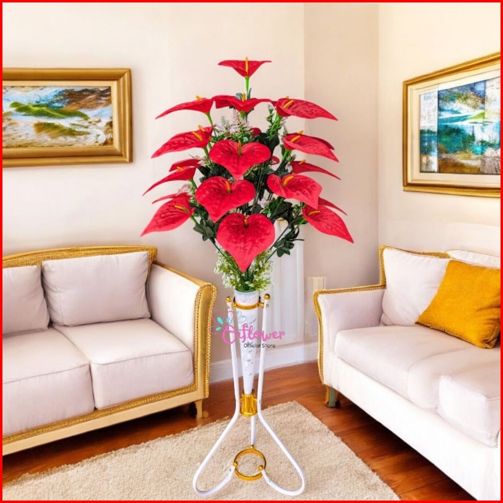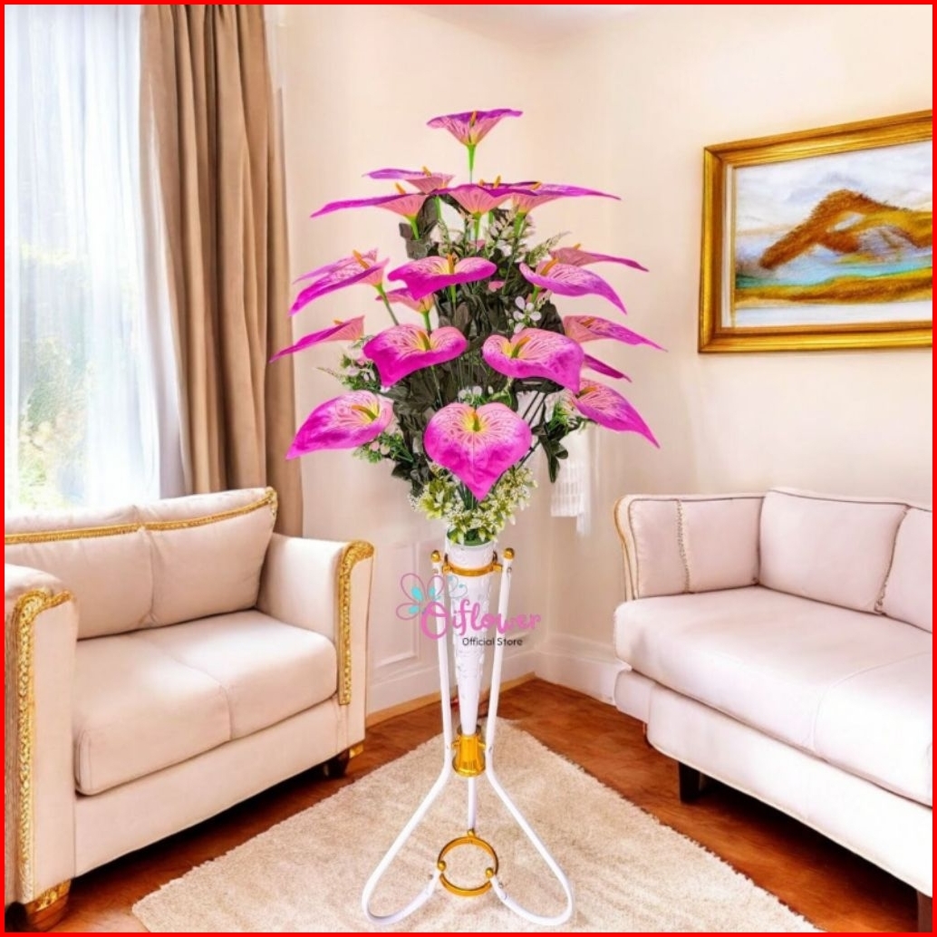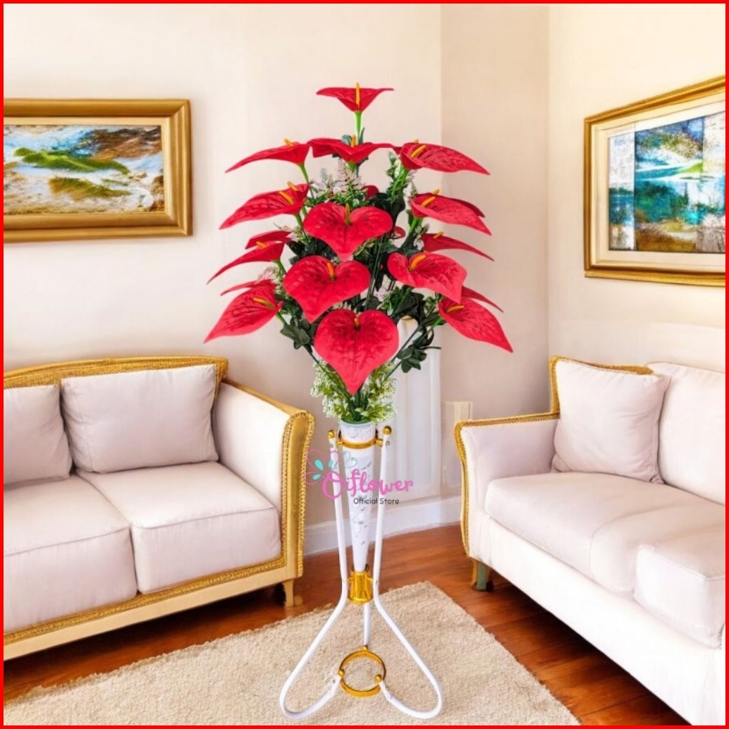 Bunga Hias Anthurium Panda 18.kuntum Satu Set Lengkap Dengan Vas Standing Besi Hiasan Dekorasi Sudut Ruangan