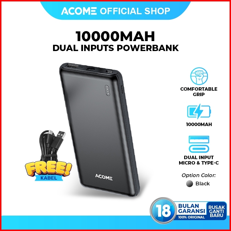 Acome Power Bank Pb 10000mah 2.1a Dual Port Micro Type-c Powerbank Travel Friendly Original - Garansi Resmi 18 Bulan Ap1