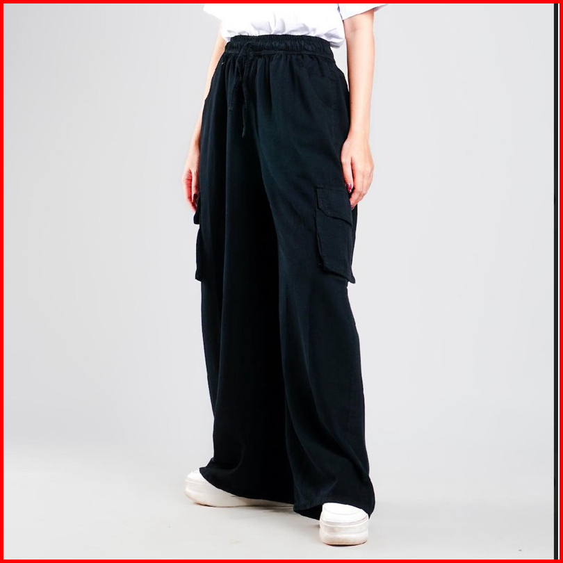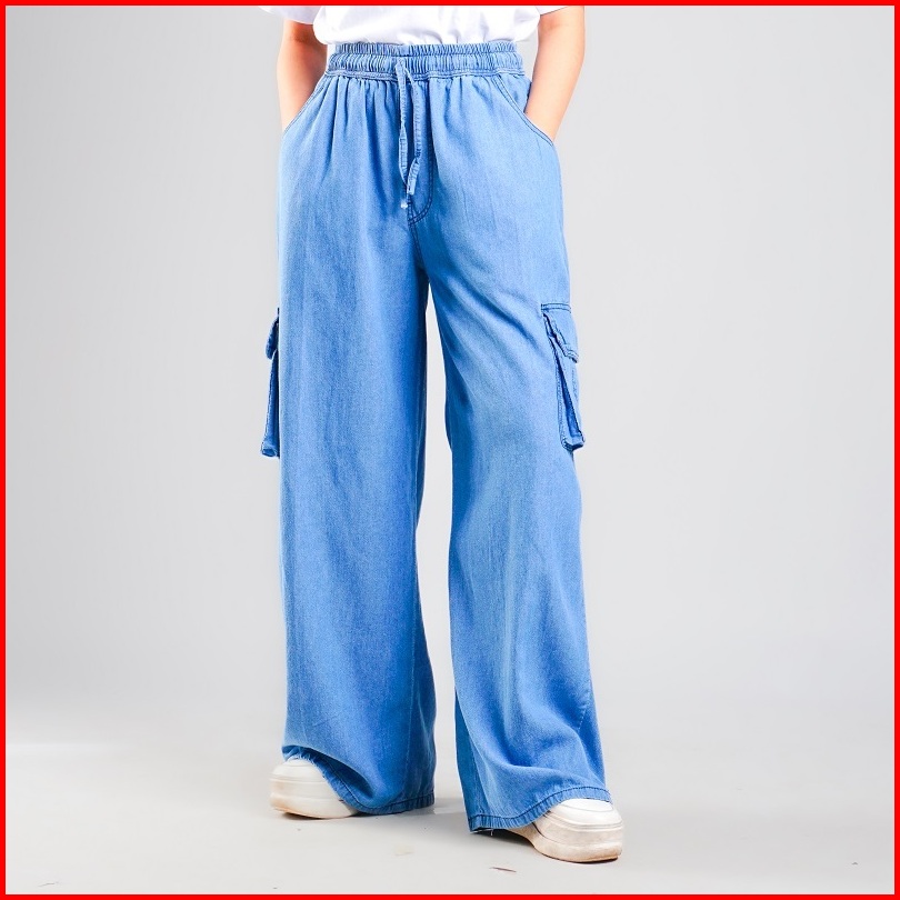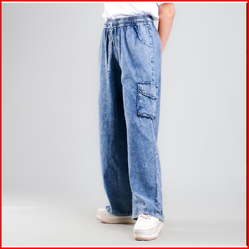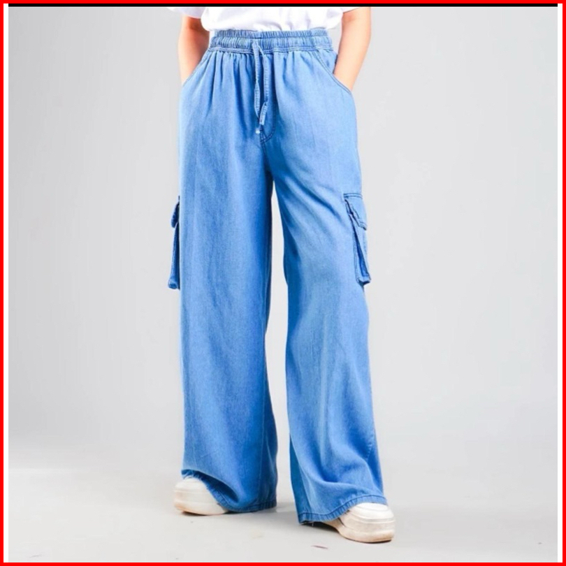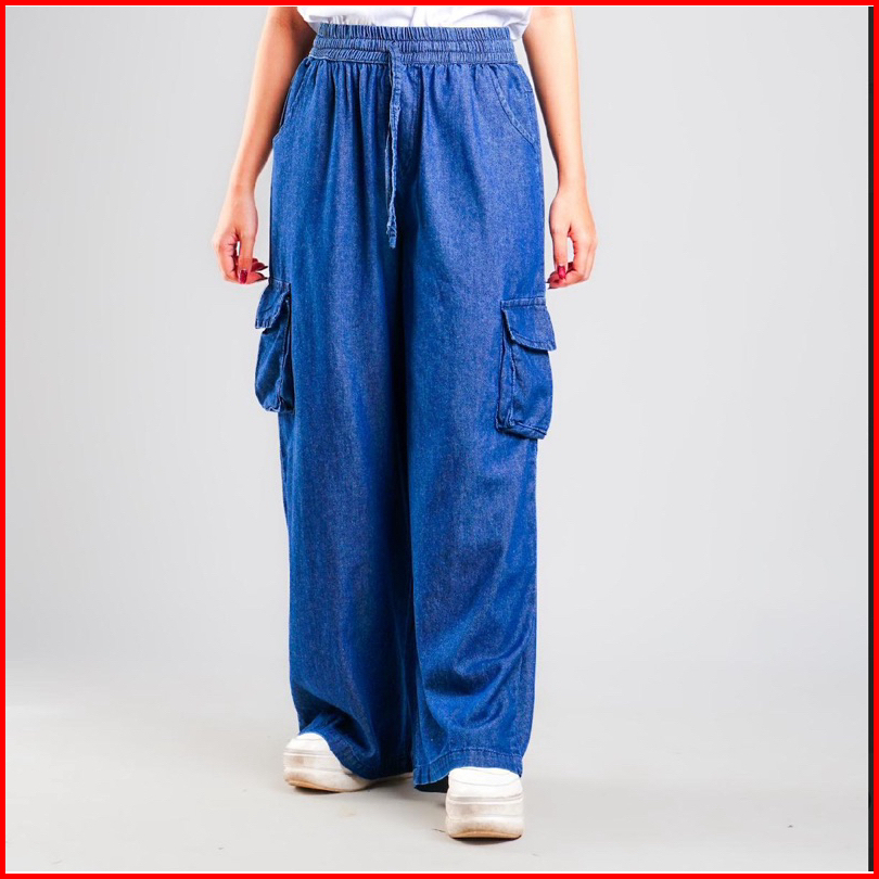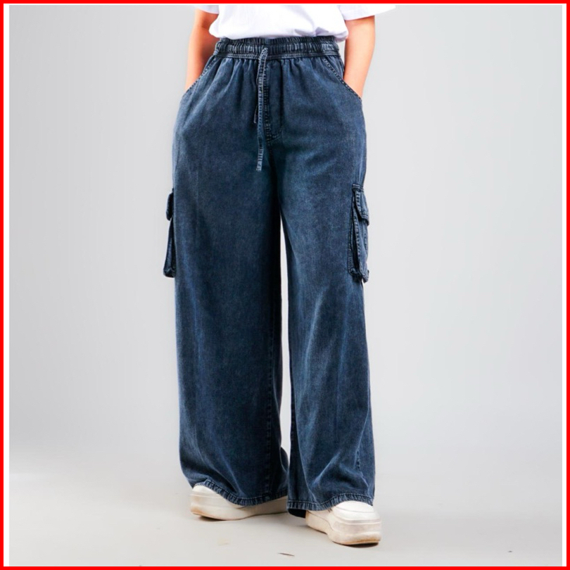 Dline Celana Cargo Kulot Highwaist Panjang Jeans Wanita Fit 100 Kg Pinggang Karet Denim Lisa Cargo