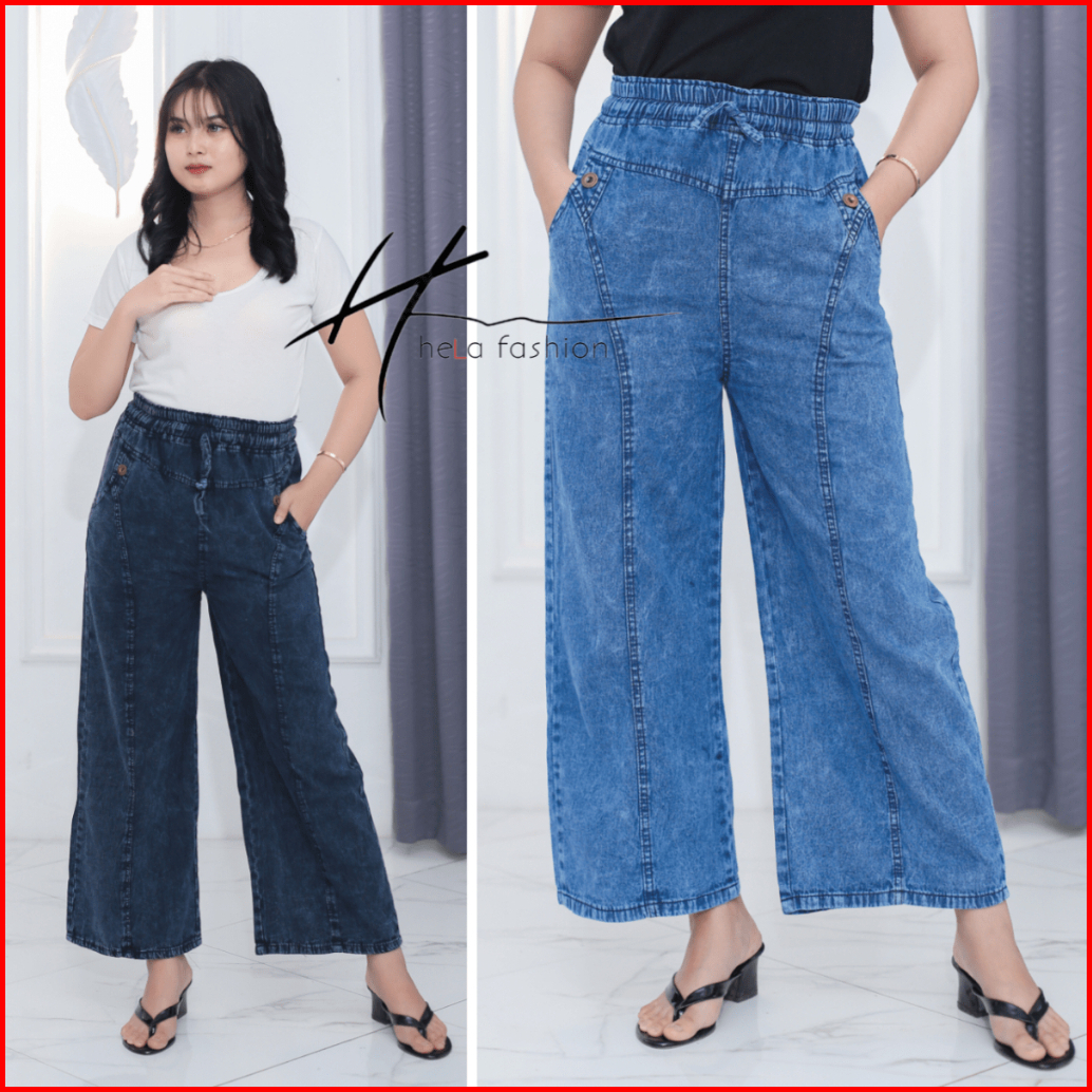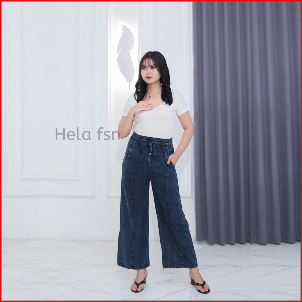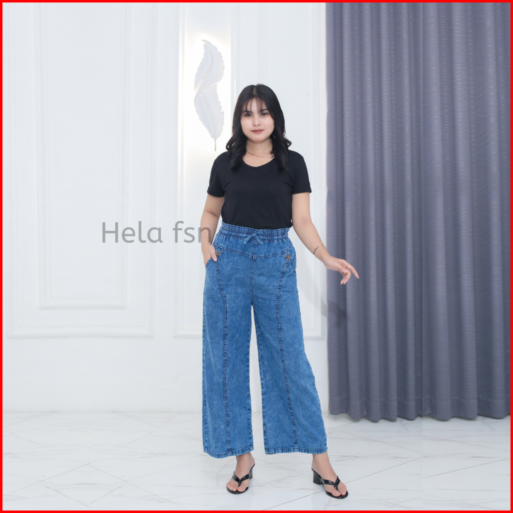 Highwaist Celana Jeans Wanita Lipat Rawis Premium Snow Tali Serut Pinggang Karet All Size