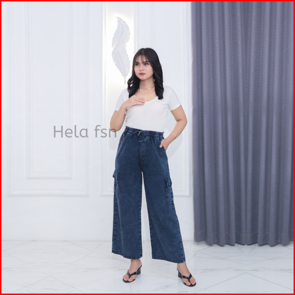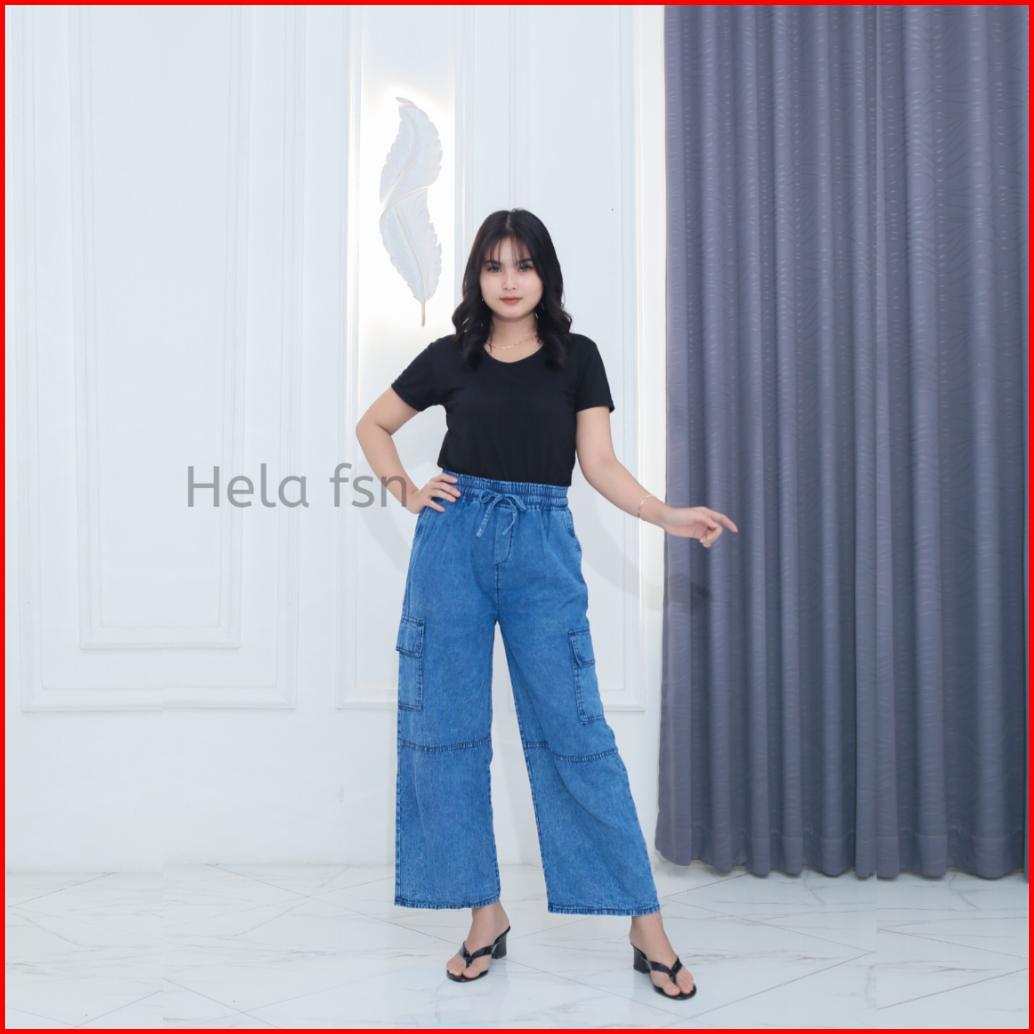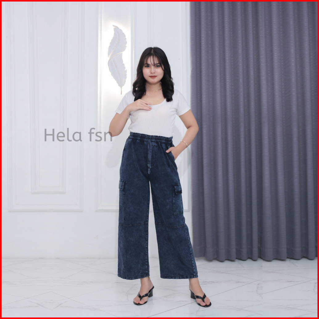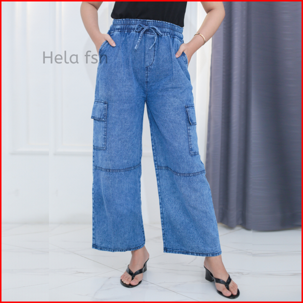 Highwaist Celana Jeans Wanita Lipat Rawis Premium Snow Tali Serut Pinggang Karet All Size