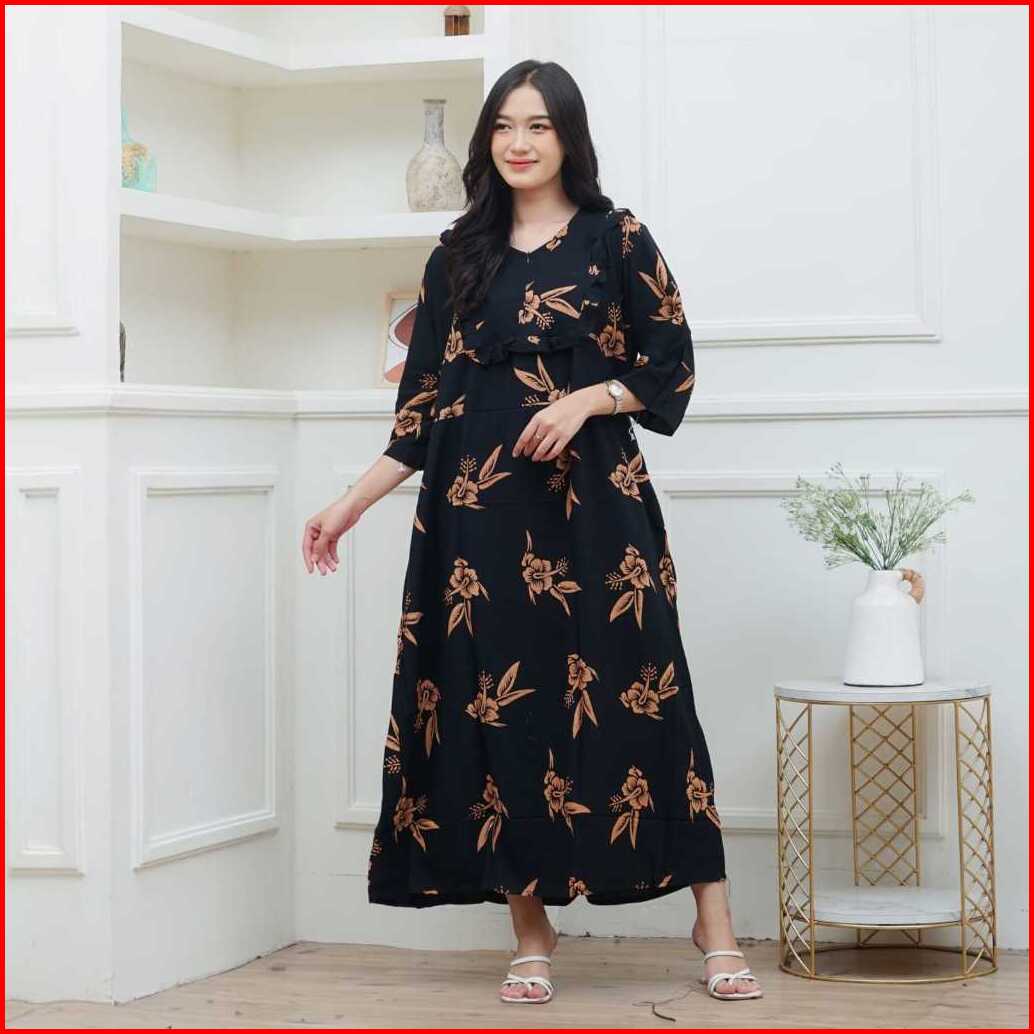 Daster Kekinian Motif Tangan 3 4 Midi Dress Wanita Rayon Bumil Busui Friendly Jumbo