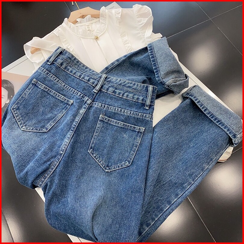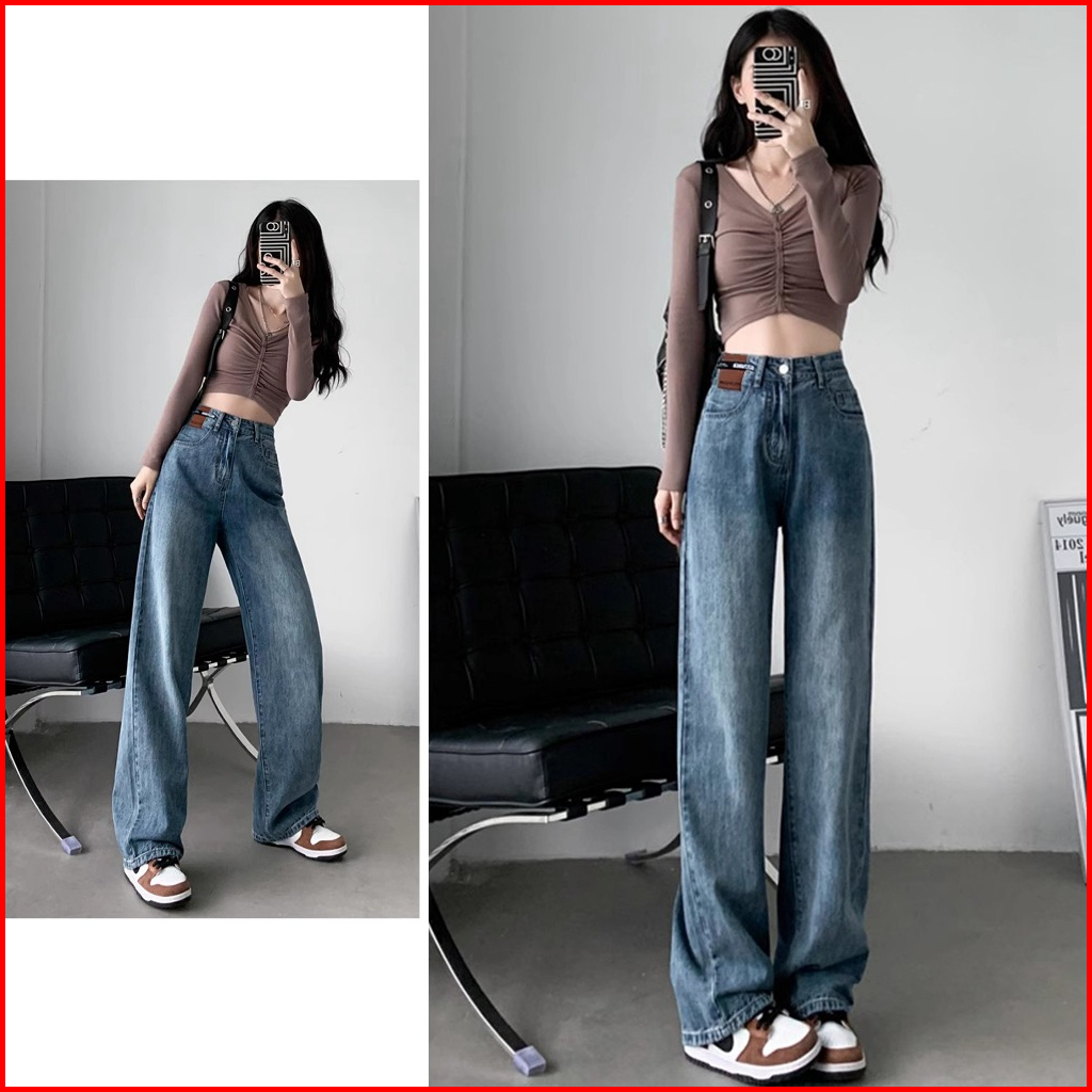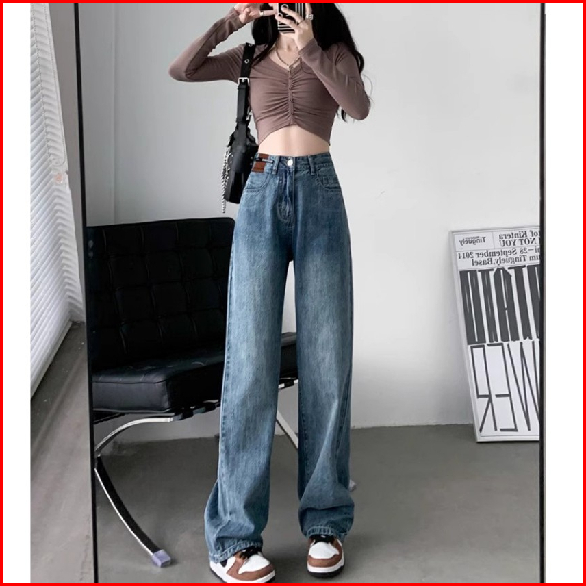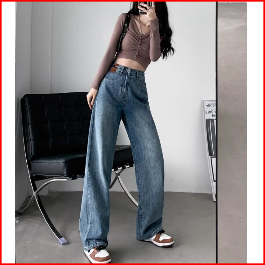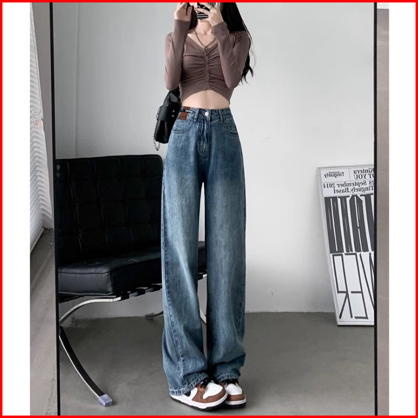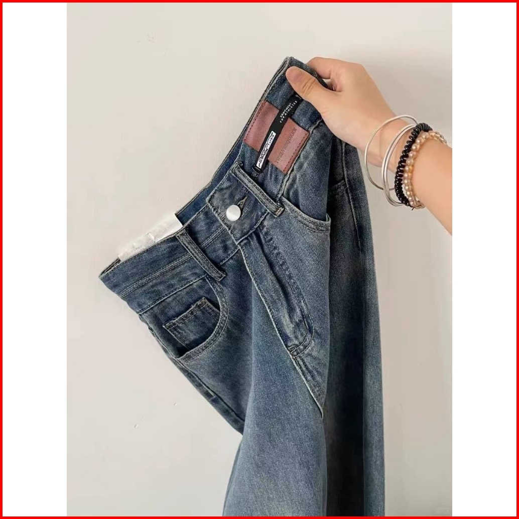 Keygirl Celana Jeans Highwaist Wanita Biru Retro Korean Style Kulot Straight Jeans Loose Pants
