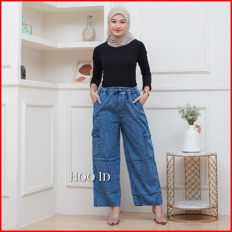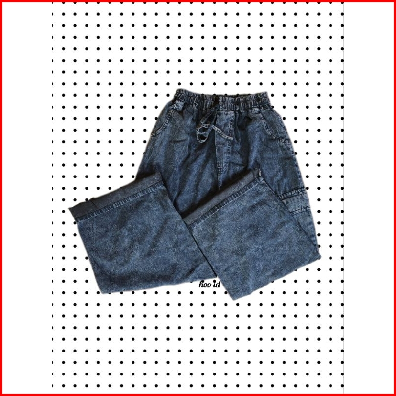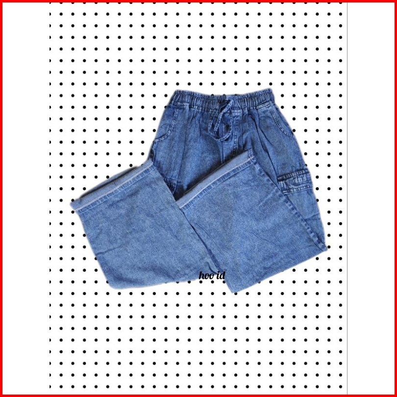 Hoo - Celana Jeans Kulot Cargo Wanita Nyaman L Standar Xl Jumbo Karet. Melar