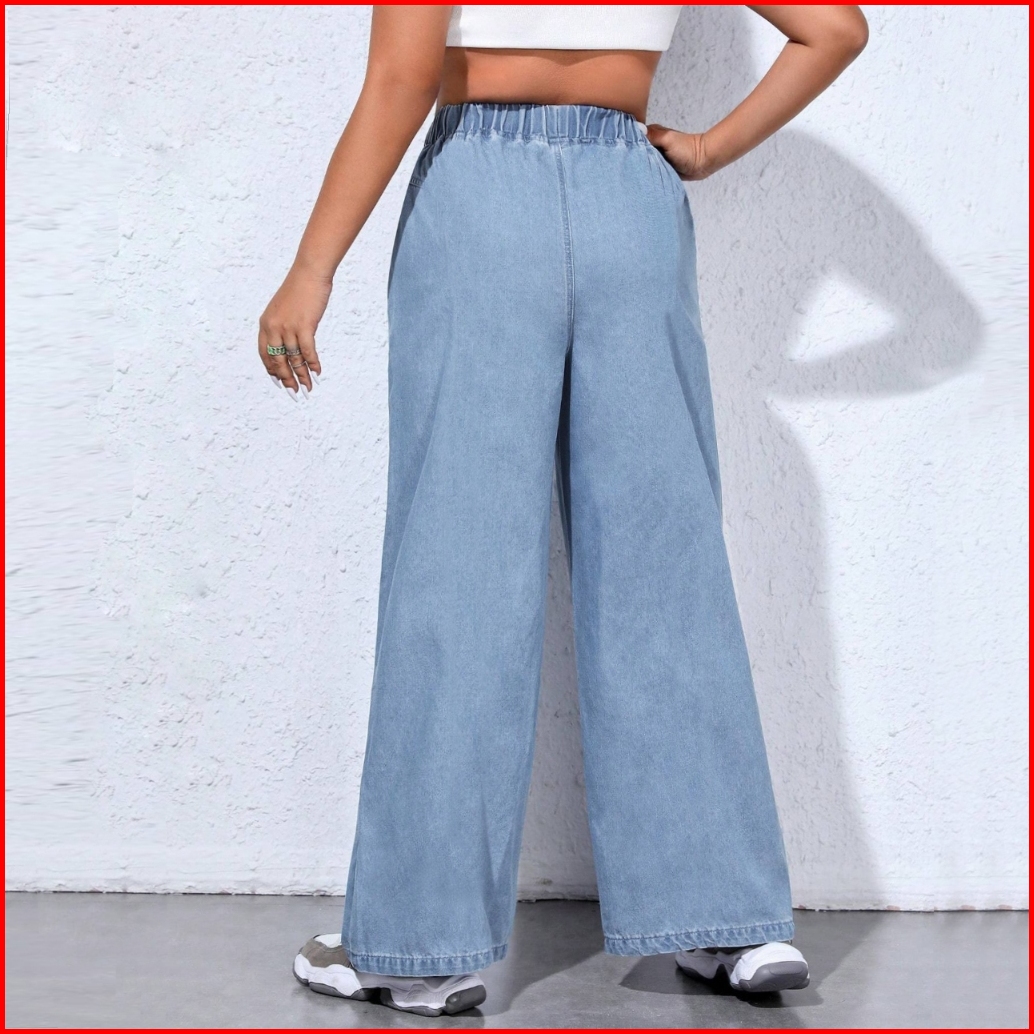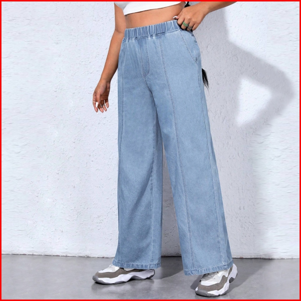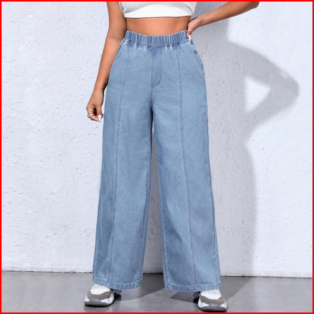 Celana Jeans Wanita Korean Style Seluar Straight Cut Wide Leg Elastic Waist Baggy Denim Jeans