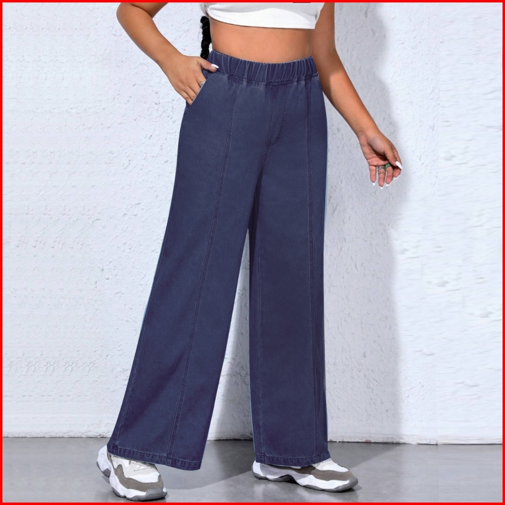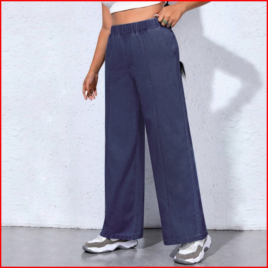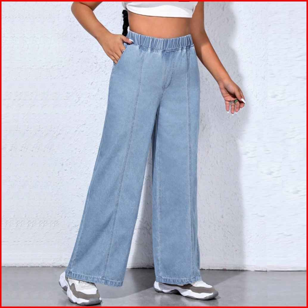 Celana Jeans Wanita Korean Style Seluar Straight Cut Wide Leg Elastic Waist Baggy Denim Jeans