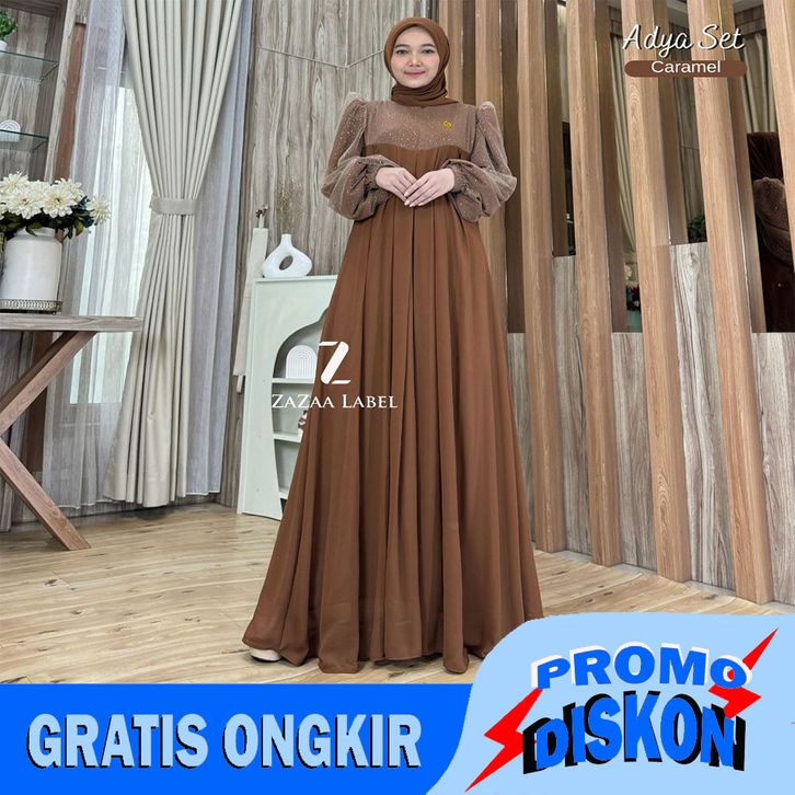 Zazaa Label - Adya Set Gamis Hijab Motif Polos Bahan Ceruty babydoll (full furing) kombinasi tile gliter sparkling Pesta