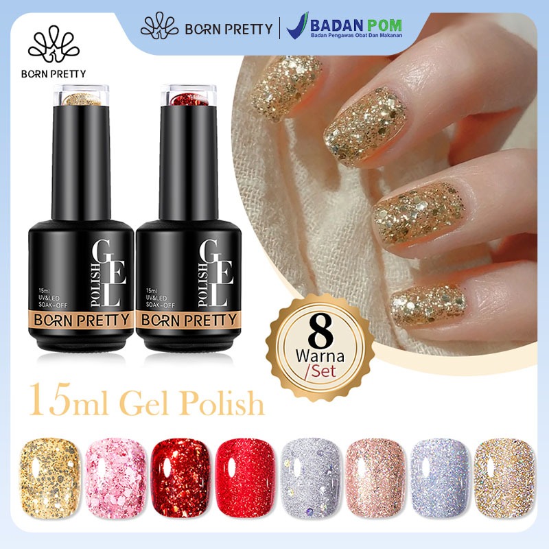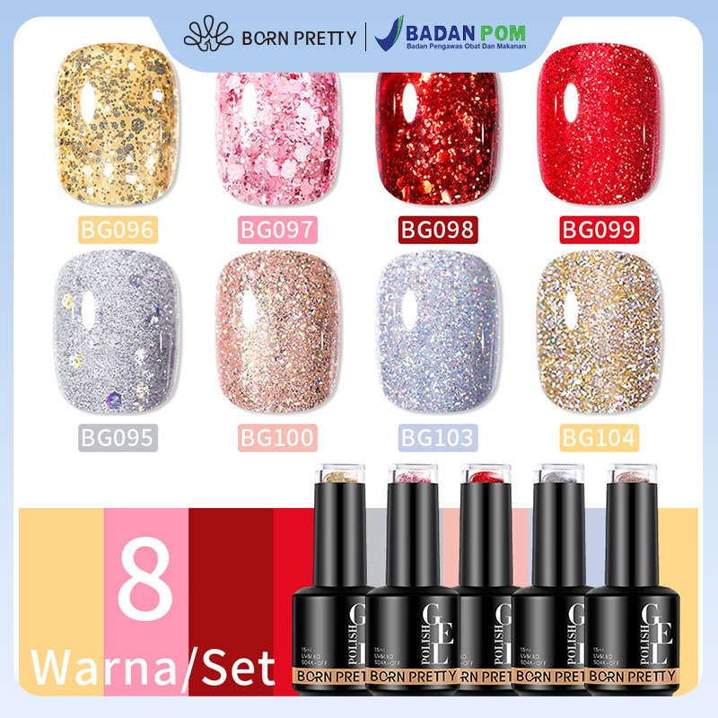 BORN PRETTY GLITTER NAIL GEL SET WARNA KUTEK GEL SET 8 COLOUR POLISH SET UV LED 15ML