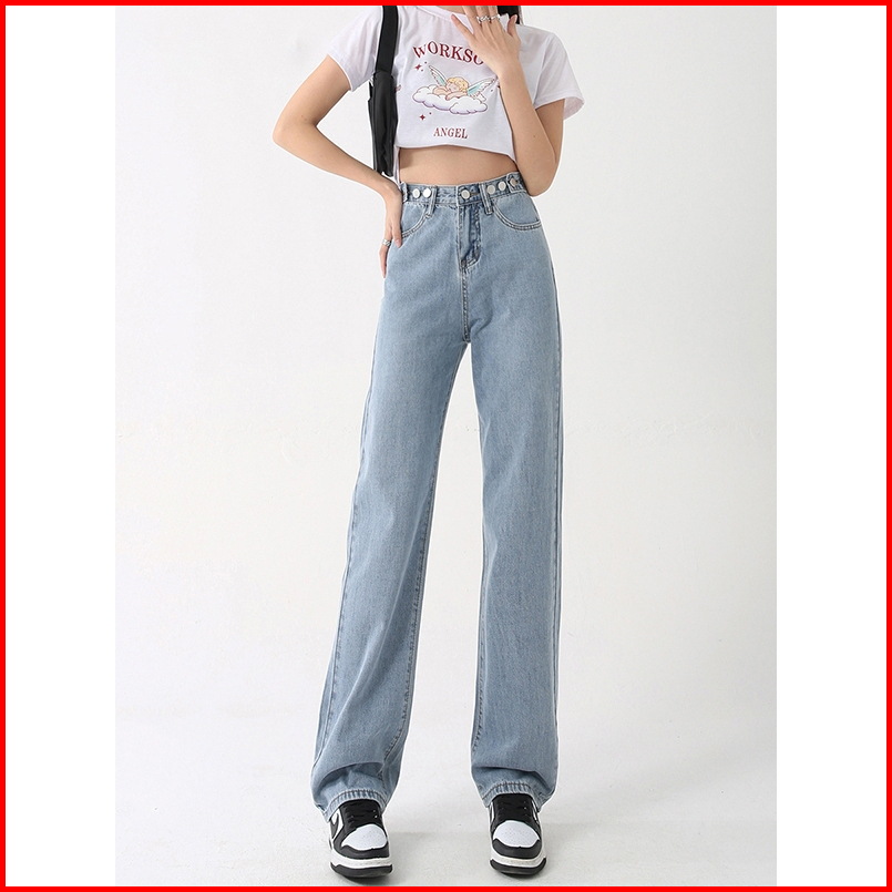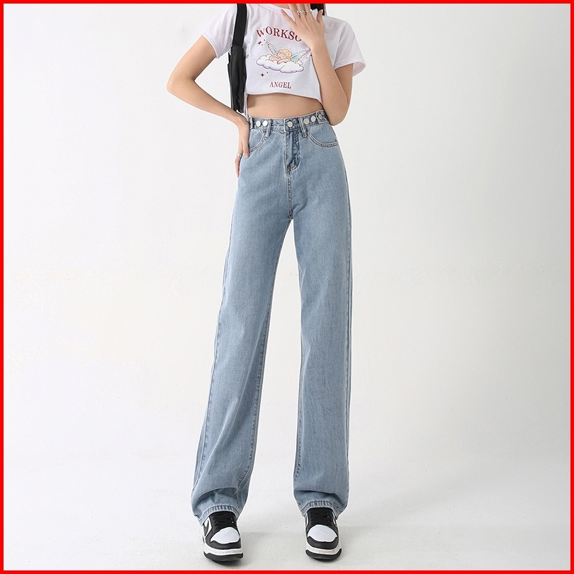 Celana Jeans Wanita Kekinian Adjustable Highwaist Straight Celana Panjang