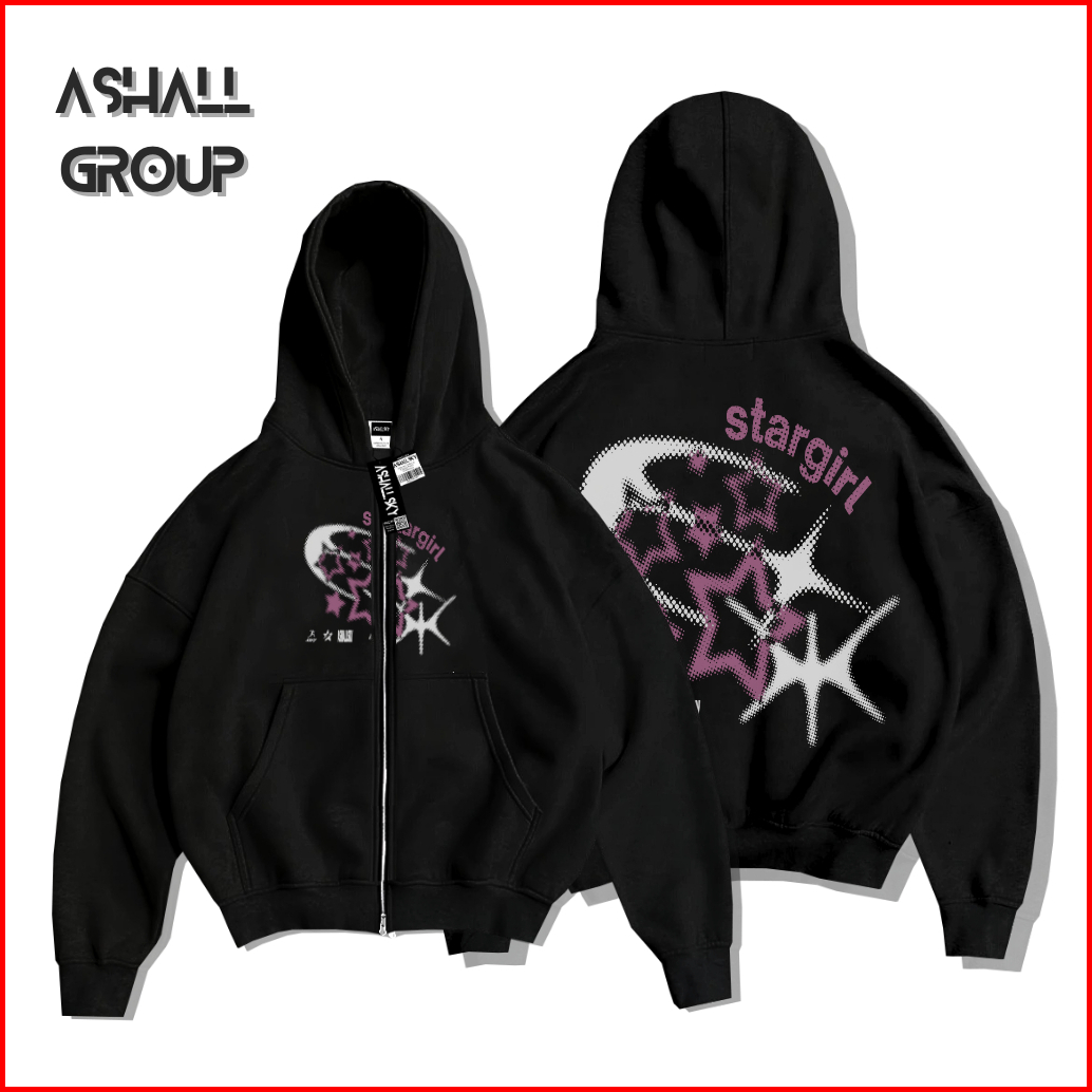 Ash.idn Hoodie Sweater Boxy Zipper Motif Stargirl New Gramasi 28 Tebal Warna Hitam
