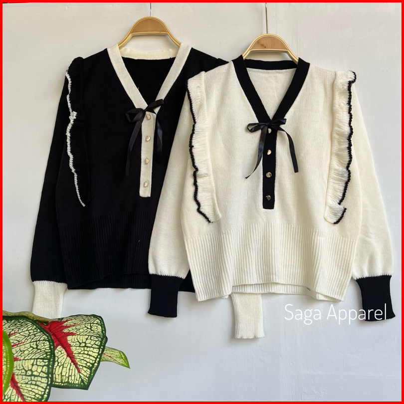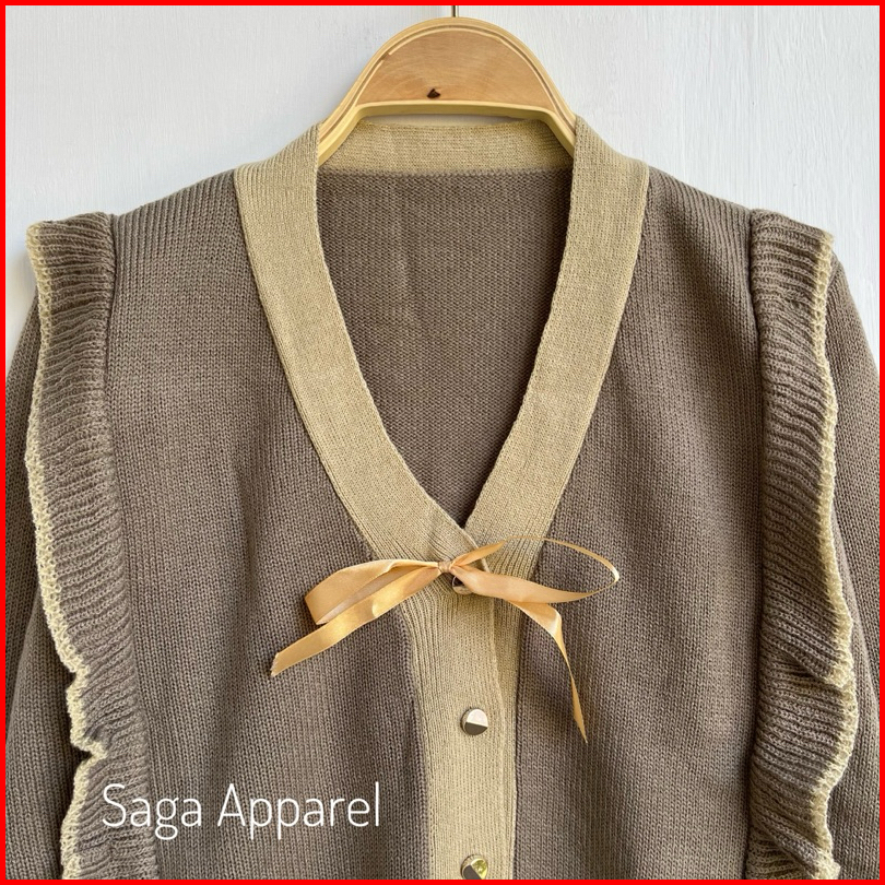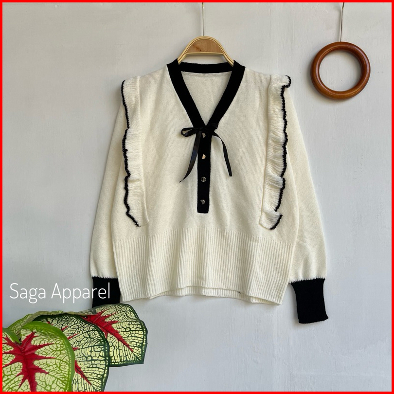 Nikita Atasan Sweater Rajut Wanita Kerah V Neck Lengan Panjang Motif Polos Variasi Kancing Dan Pita Rumbai