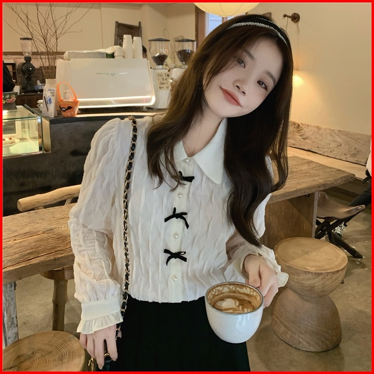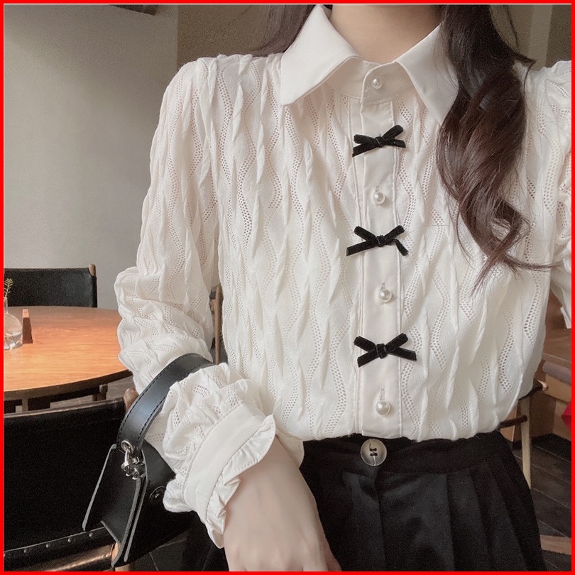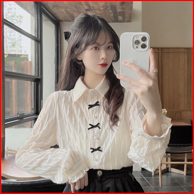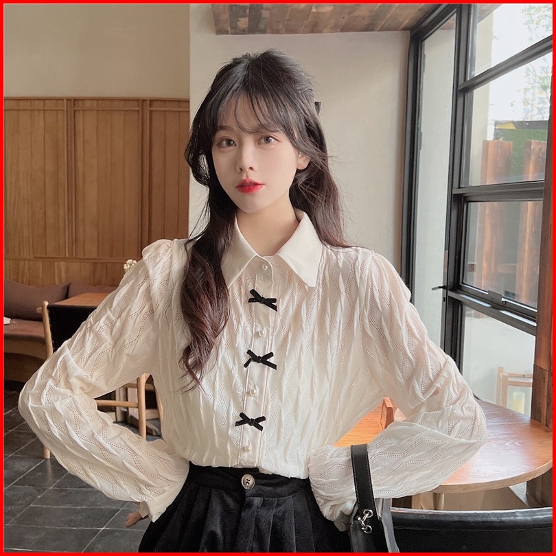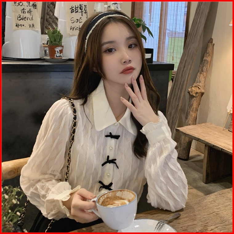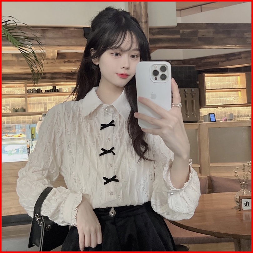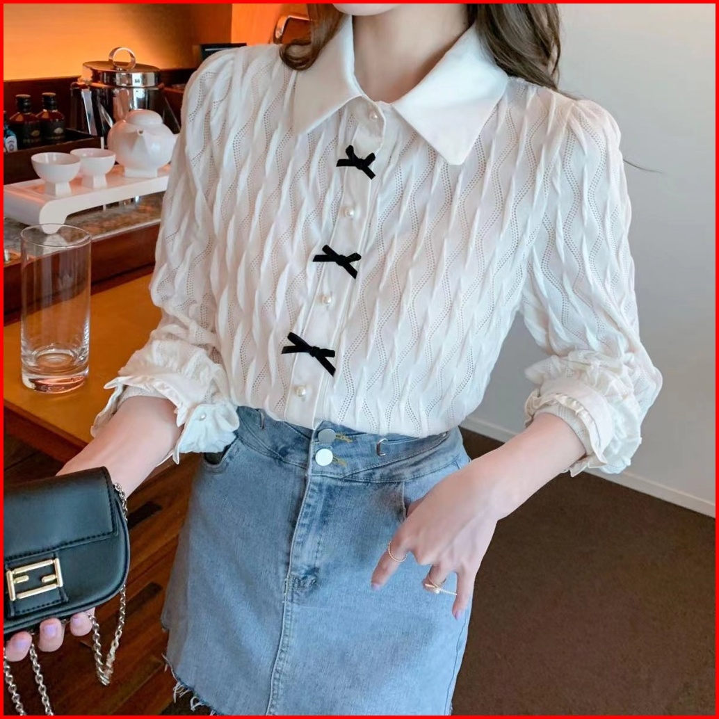 Yikoo-kemeja Korea Kancing Busur Elegan Shirt Blouse Wanita Atasan