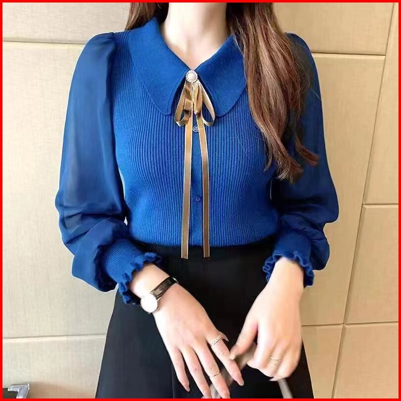 Tteuda Korean Blouse Long Sleeve Model Ripped Neck Casual Blouse Wanita Korea Import Lengan Panjang Premium Kekinian Blu