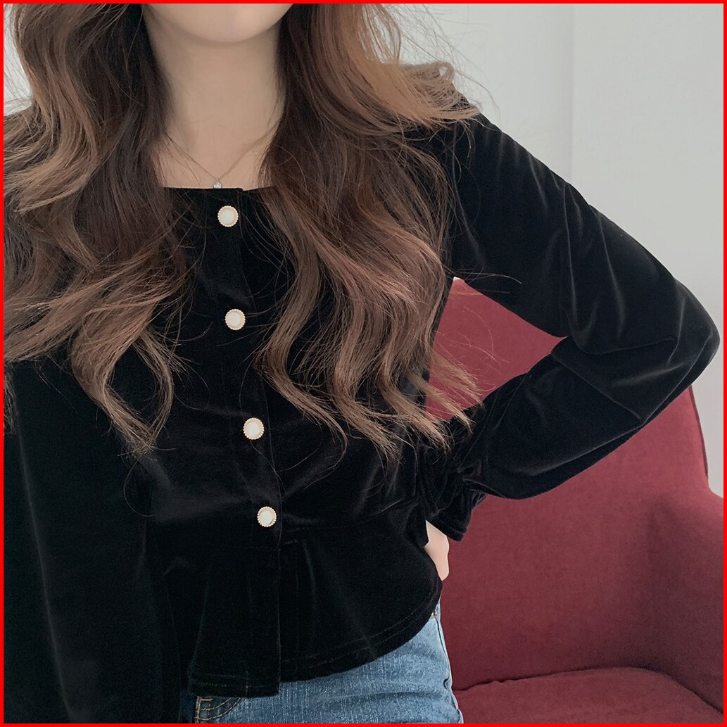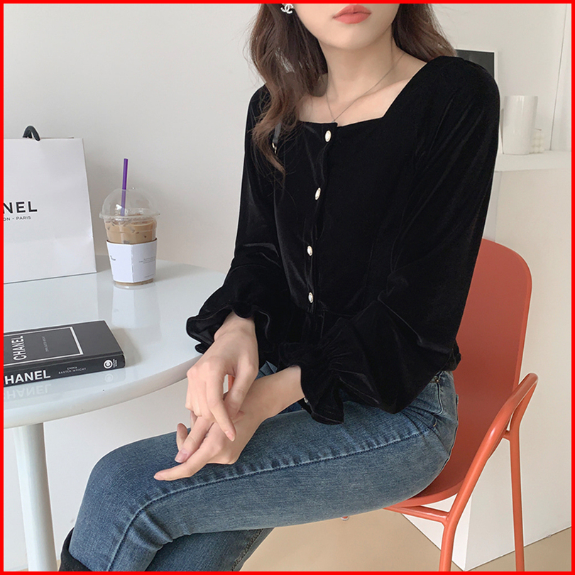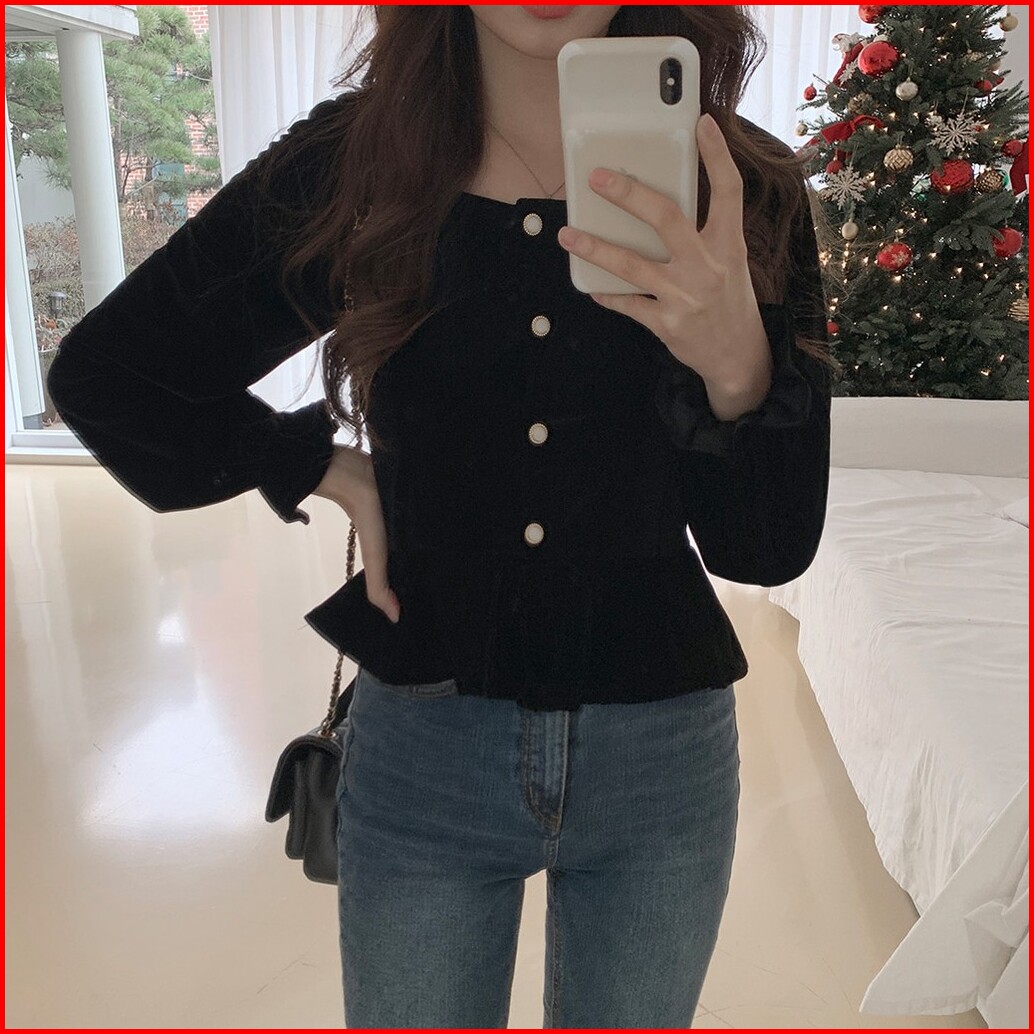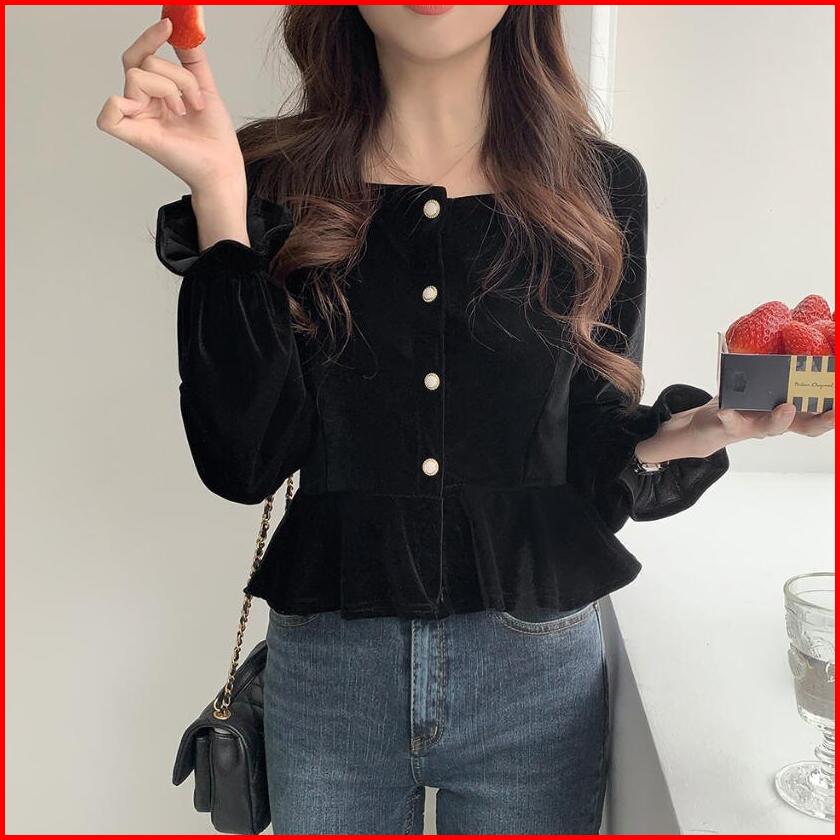 Yikoo-atasan Flanel Hitam Kemeja Lengan Panjang Wanita Baju Top