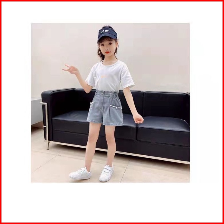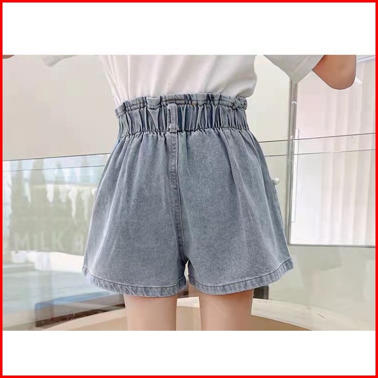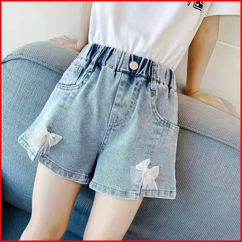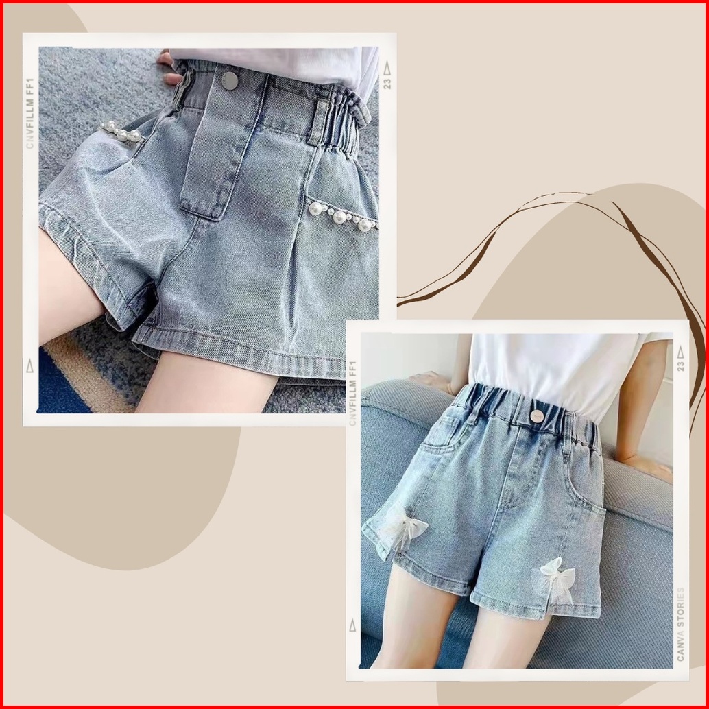 New Hotpants Celana Jeans Highwaist Pendek Anak Perempuan Motif Mutiara Dan Pita