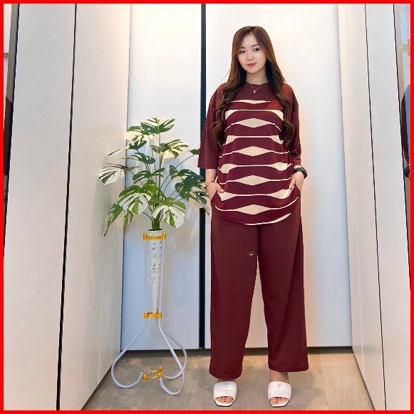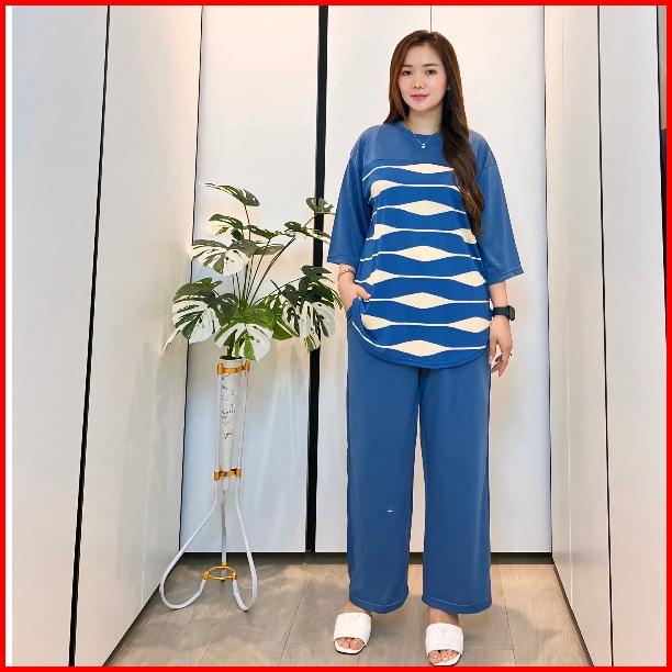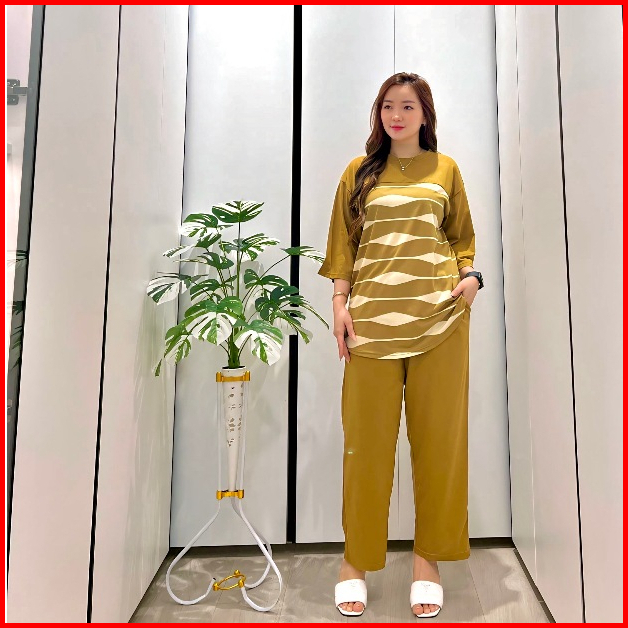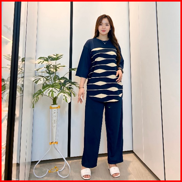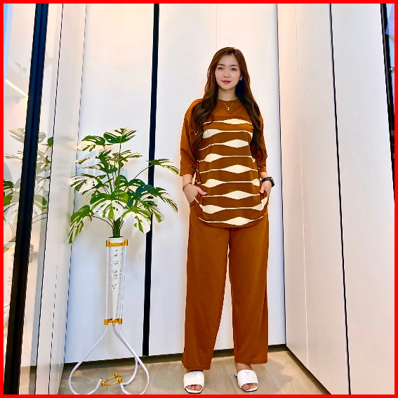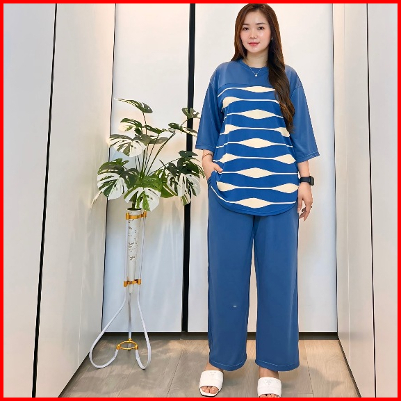Setelan Wanita Kekinian Ld 120 Cm Motif Full Print Atasan Model Oval Lengan 3 4 Dan Celana Panjang Oneset Casual Fashion