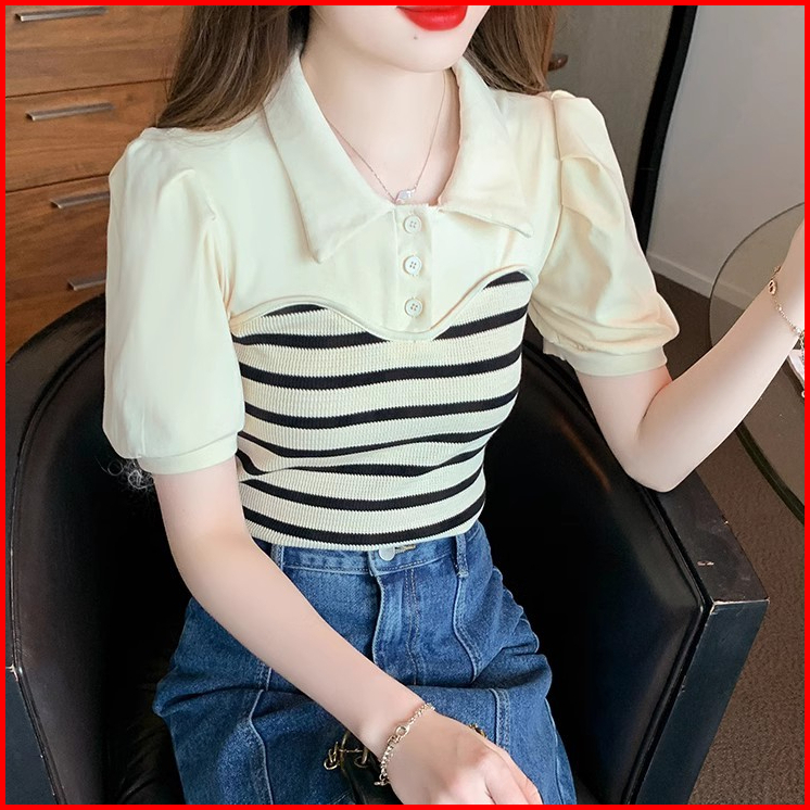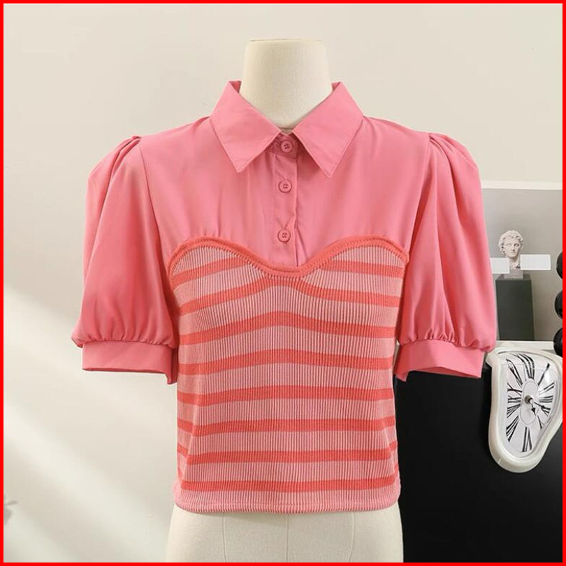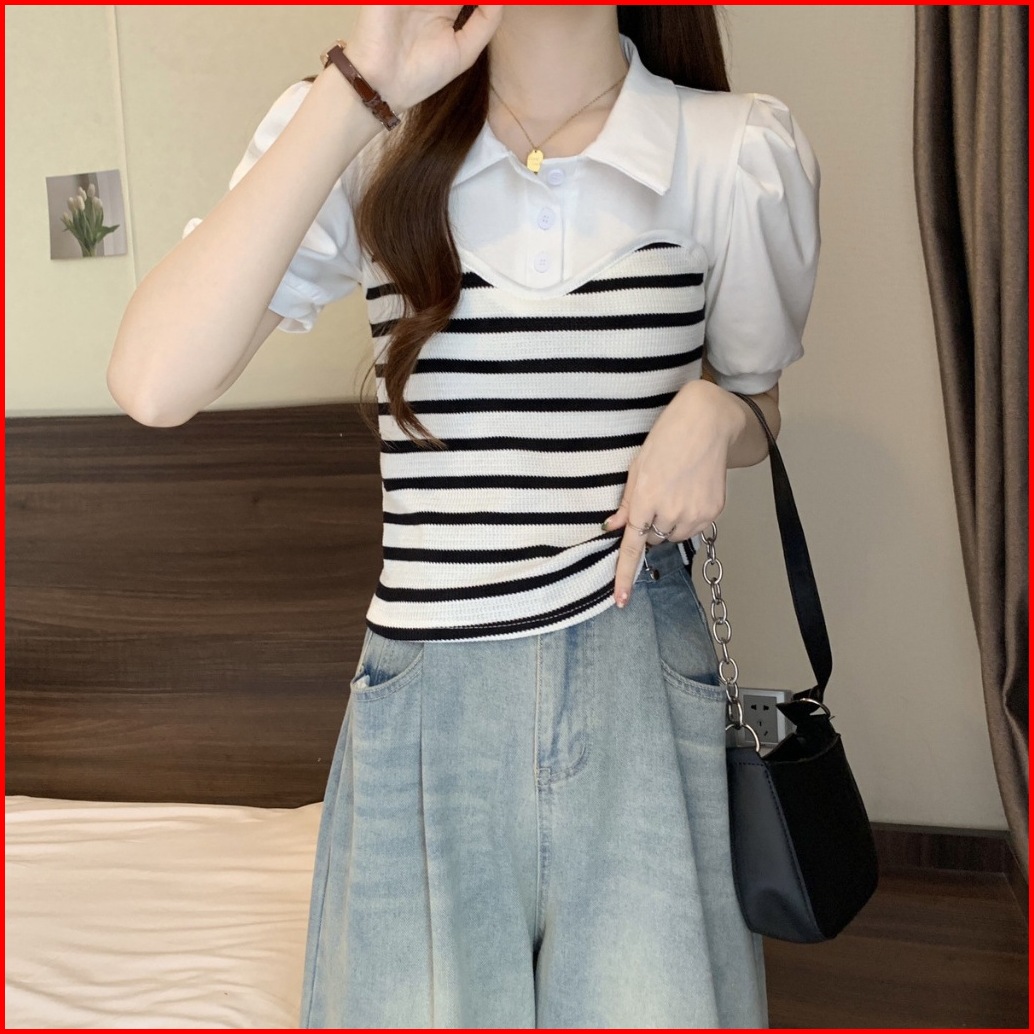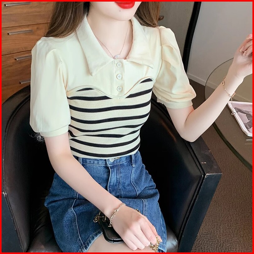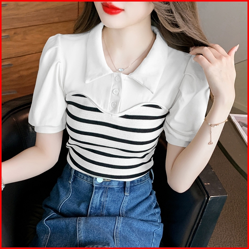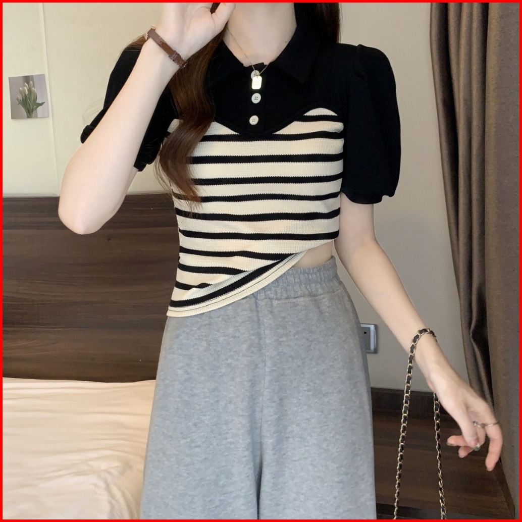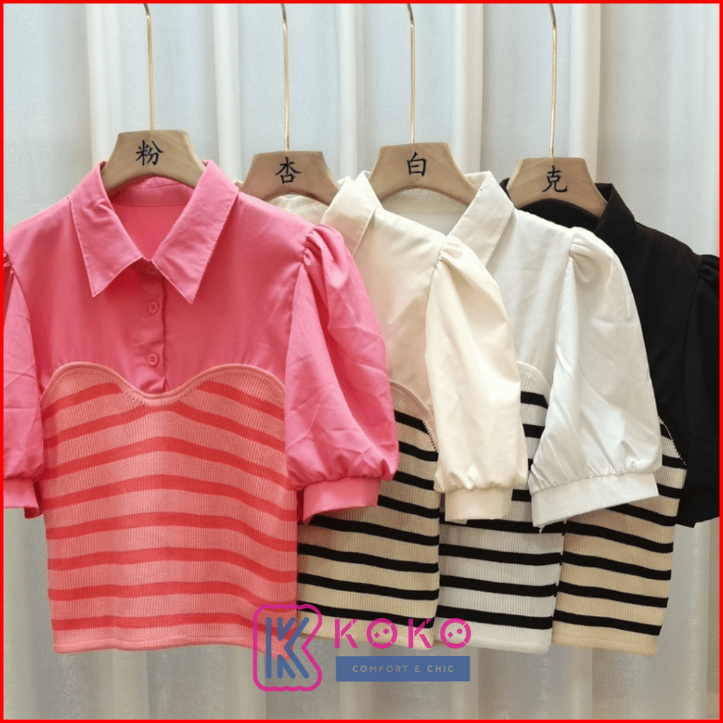 Koko - Atasan Lengan Pendek Garis Berkerah Polo Kombi Kemeja Katun Rajut Wanita Cewek Import